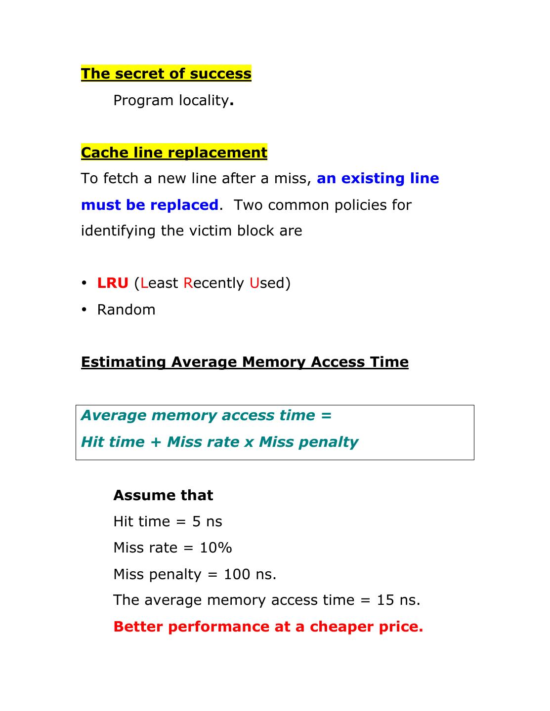 4 .The secret of success Program locality. Cache line replacement To fetch a new line after a miss, an existing line must be replaced. Two common policies for identifying the victim block are • LRU (Least Recently Used) • Random Estimating Average Memory Access Time Average memory access time = Hit time + Miss rate x Miss penalty Assume that Hit time = 5 ns Miss rate = 10% Miss penalty = 100 ns. The average memory access time = 15 ns. Better performance at a cheaper price.