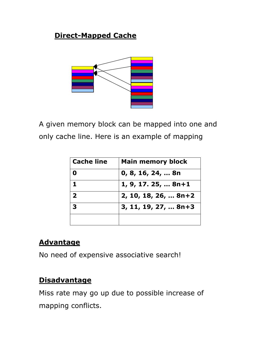 5 . Direct-Mapped Cache A given memory block can be mapped into one and only cache line. Here is an example of mapping Cache line Main memory block 0 0, 8, 16, 24, … 8n 1 1, 9, 17. 25, … 8n+1 2 2, 10, 18, 26, … 8n+2 3 3, 11, 19, 27, … 8n+3 Advantage No need of expensive associative search! Disadvantage Miss rate may go up due to possible increase of mapping conflicts.