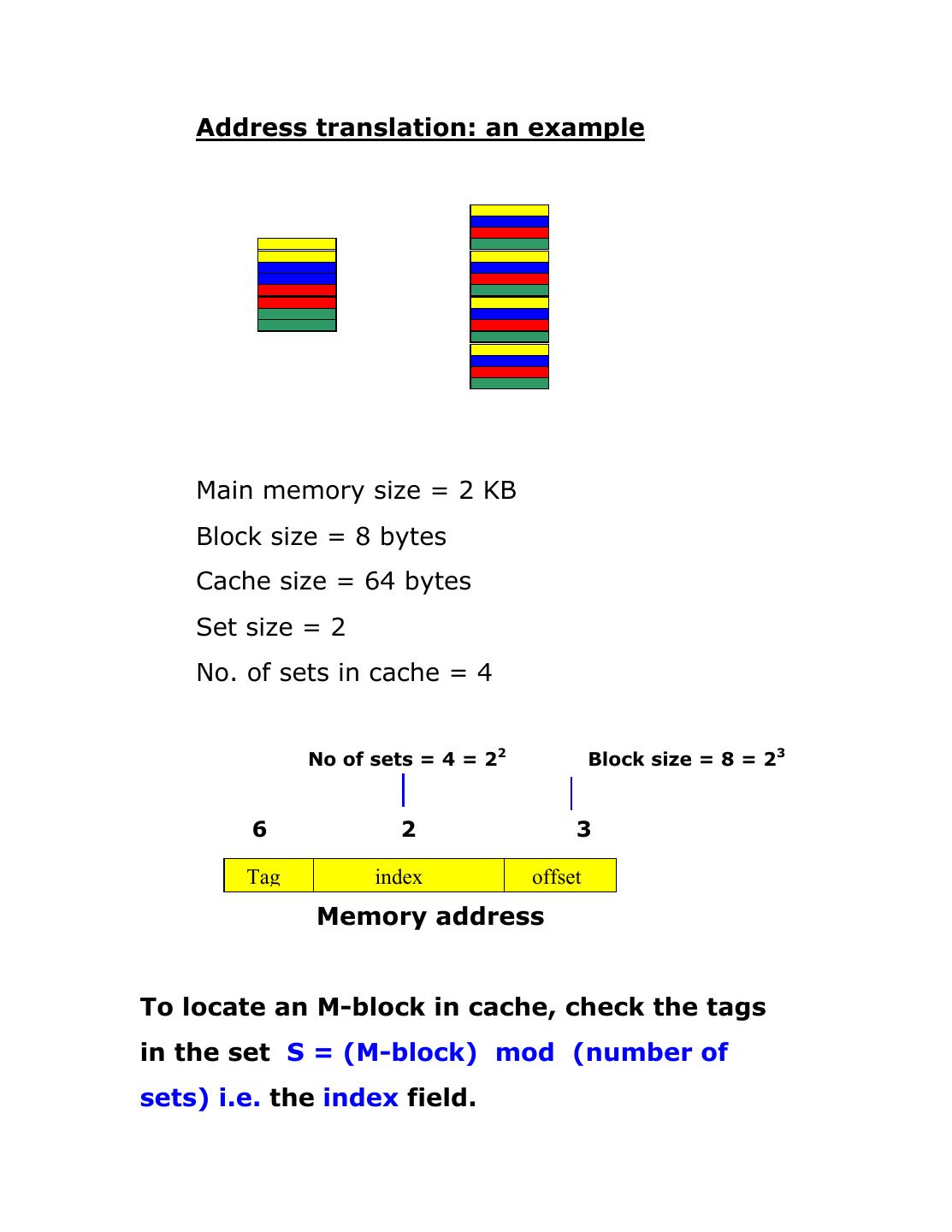 7 . Address translation: an example Main memory size = 2 KB Block size = 8 bytes Cache size = 64 bytes Set size = 2 No. of sets in cache = 4 No of sets = 4 = 22 Block size = 8 = 23 6 2 3 Tag index offset Memory address To locate an M-block in cache, check the tags in the set S = (M-block) mod (number of sets) i.e. the index field.