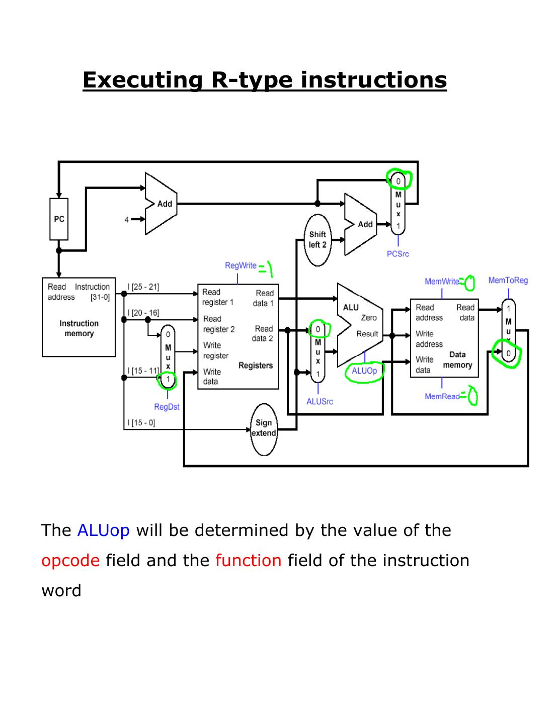3 . Executing R-type instructions The ALUop will be determined by the value of the opcode field and the function field of the instruction word