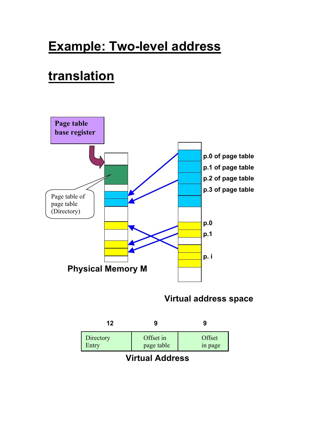 4 .Example: Two-level address translation Page table base register p.0 of page table p.1 of page table p.2 of page table p.3 of page table Page table of page table (Directory) p.0 p.1 p. i Physical Memory M Virtual address space 12 9 9 Directory Offset in Offset Entry page table in page Virtual Address