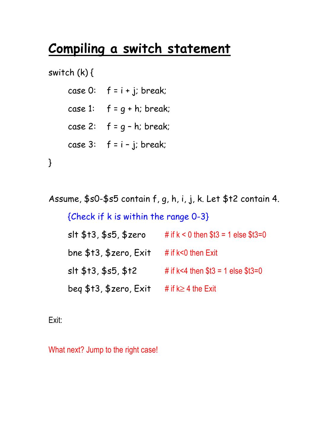2 .Compiling a switch statement switch (k) { case 0: f = i + j; break; case 1: f = g + h; break; case 2: f = g – h; break; case 3: f = i – j; break; } Assume, $s0-$s5 contain f, g, h, i, j, k. Let $t2 contain 4. {Check if k is within the range 0-3} slt $t3, $s5, $zero # if k < 0 then $t3 = 1 else $t3=0 bne $t3, $zero, Exit # if k<0 then Exit slt $t3, $s5, $t2 # if k<4 then $t3 = 1 else $t3=0 beq $t3, $zero, Exit # if k≥ 4 the Exit Exit: What next? Jump to the right case!