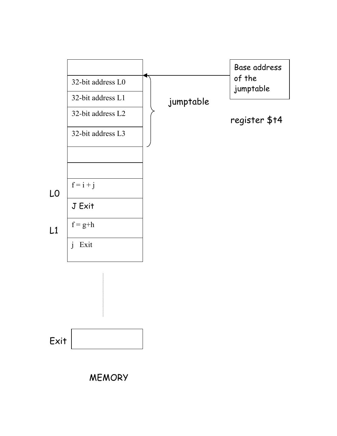 3 . Base address 32-bit address L0 of the jumptable 32-bit address L1 jumptable 32-bit address L2 register $t4 32-bit address L3 f=i+j L0 J Exit f = g+h L1 j Exit Exit MEMORY