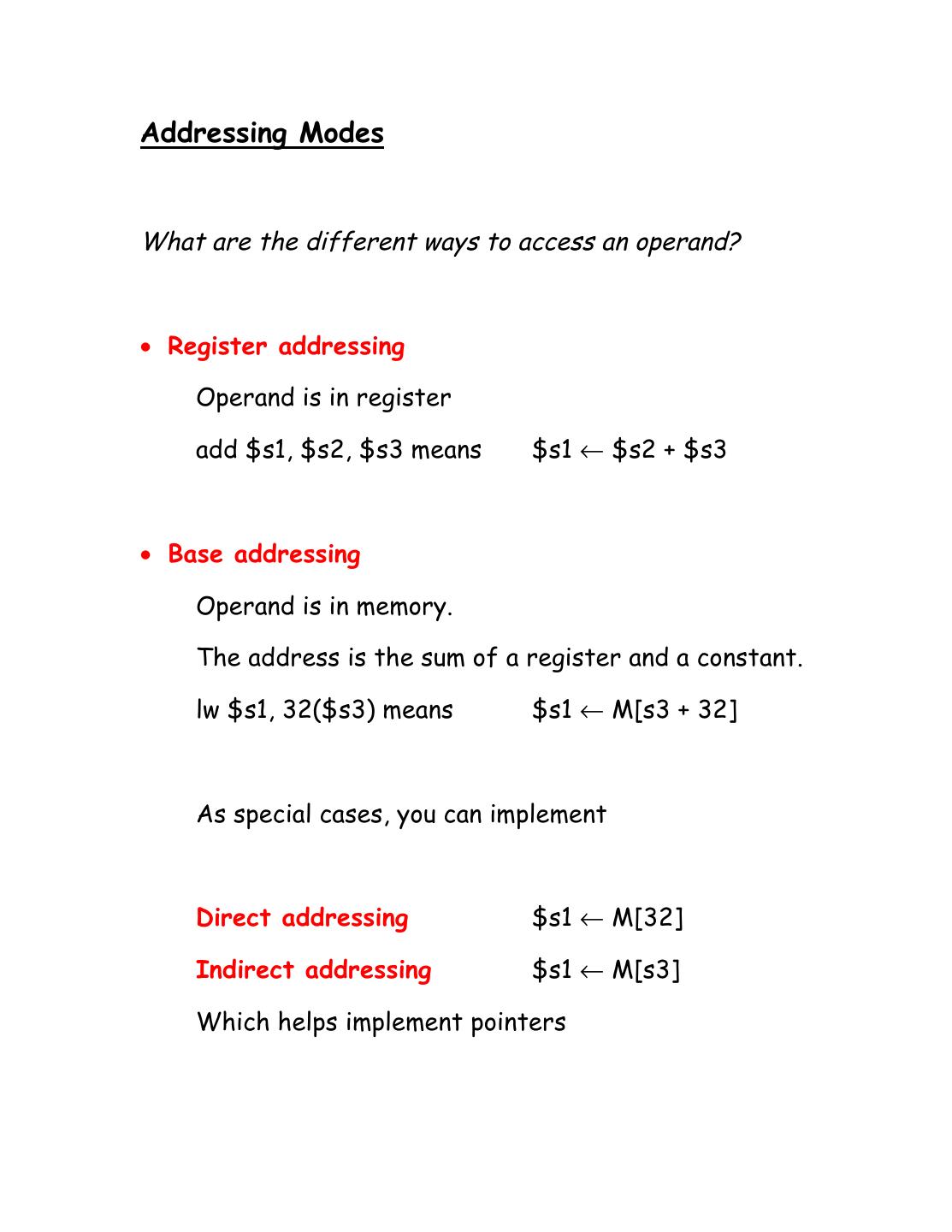 8 .• Immediate addressing The operand is a constant. How can you execute $s1 ← 7? addi $s1, $zero, 7 means $s1 ← 0 + 7 (add immediate, uses the I-type format) • PC-relative addressing The operand address = PC + an offset Implements position-independent codes. A small offset is adequate for short loops. • Pseudo-direct addressing Used in the J format. The target address is the concatenation of the 4 MSB’s of the PC with the 28-bit offset. This is a minor variation of the PC-relative addressing format.