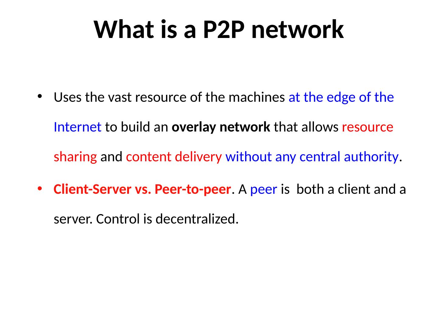 2 .What is a P2P network Uses the vast resource of the machines at the edge of the Internet to build an overlay network that allows resource sharing and content delivery without any central authority . Client-Server vs. Peer-to-peer . A peer is both a client and a server. Control is decentralized.
