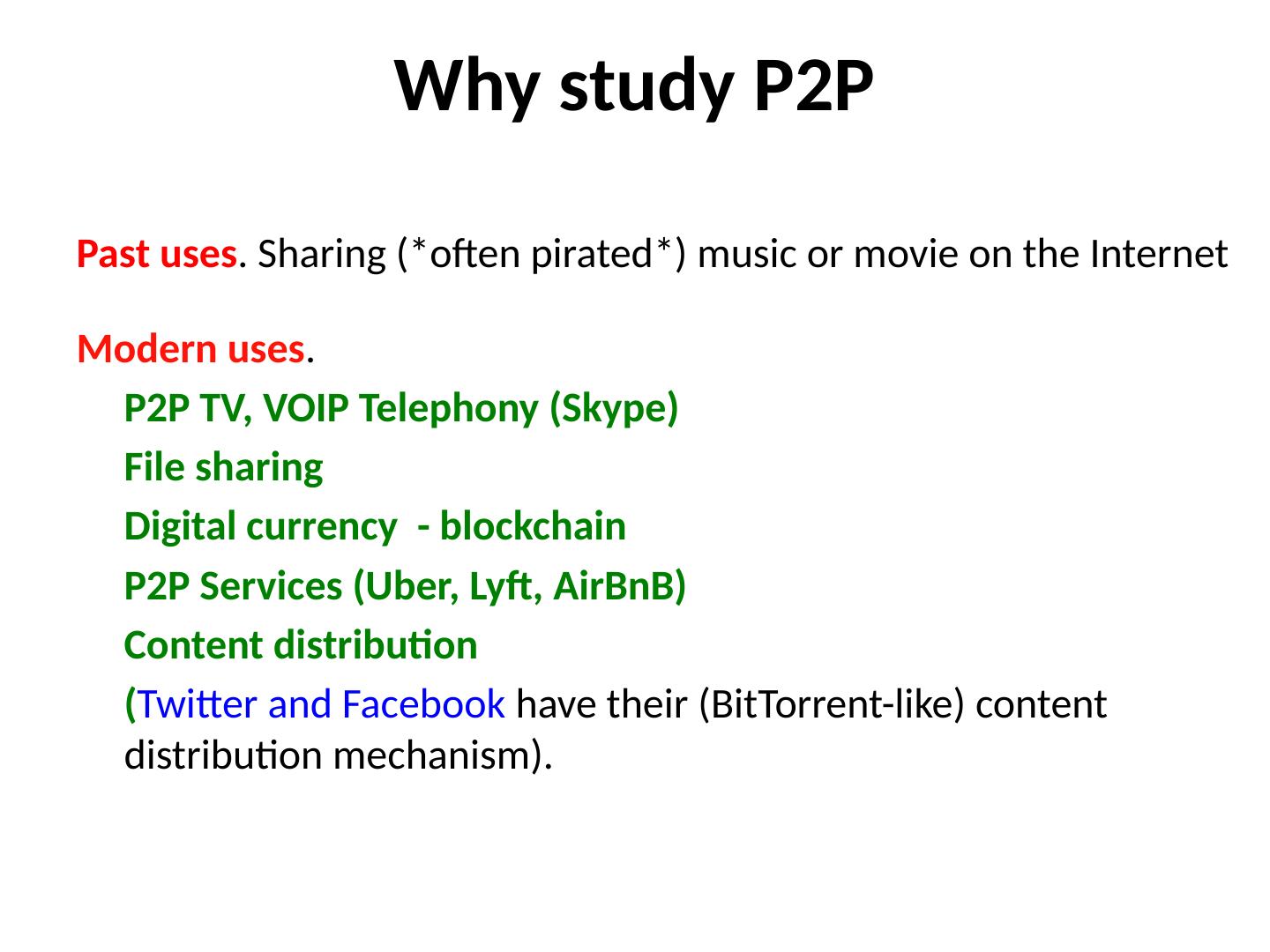 3 .Why study P2P Past uses . Sharing (*often pirated*) music or movie on the Internet Modern uses . P2P TV, VOIP Telephony (Skype) File sharing Digital currency - blockchain P2P Services (Uber, Lyft, AirBnB ) Content distribution ( Twitter and Facebook have their ( BitTorrent -like) content distribution mechanism).