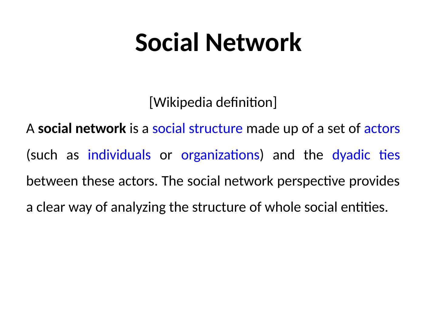 5 .Social Network [Wikipedia definition] A social network is a social structure made up of a set of actors (such as individuals or organizations ) and the dyadic ties between these actors. The social network perspective provides a clear way of analyzing the structure of whole social entities.