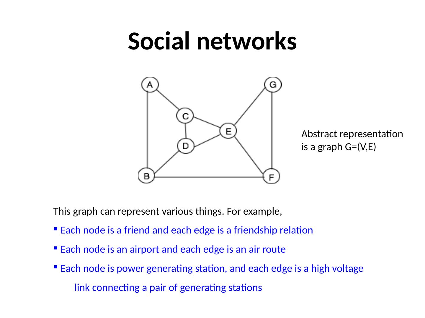 6 .Social networks This graph can represent various things. For example, Each node is a friend and each edge is a friendship relation Each node is an airport and each edge is an air route Each node is power generating station, and each edge is a high voltage link connecting a pair of generating stations Abstract representation is a graph G=(V,E)