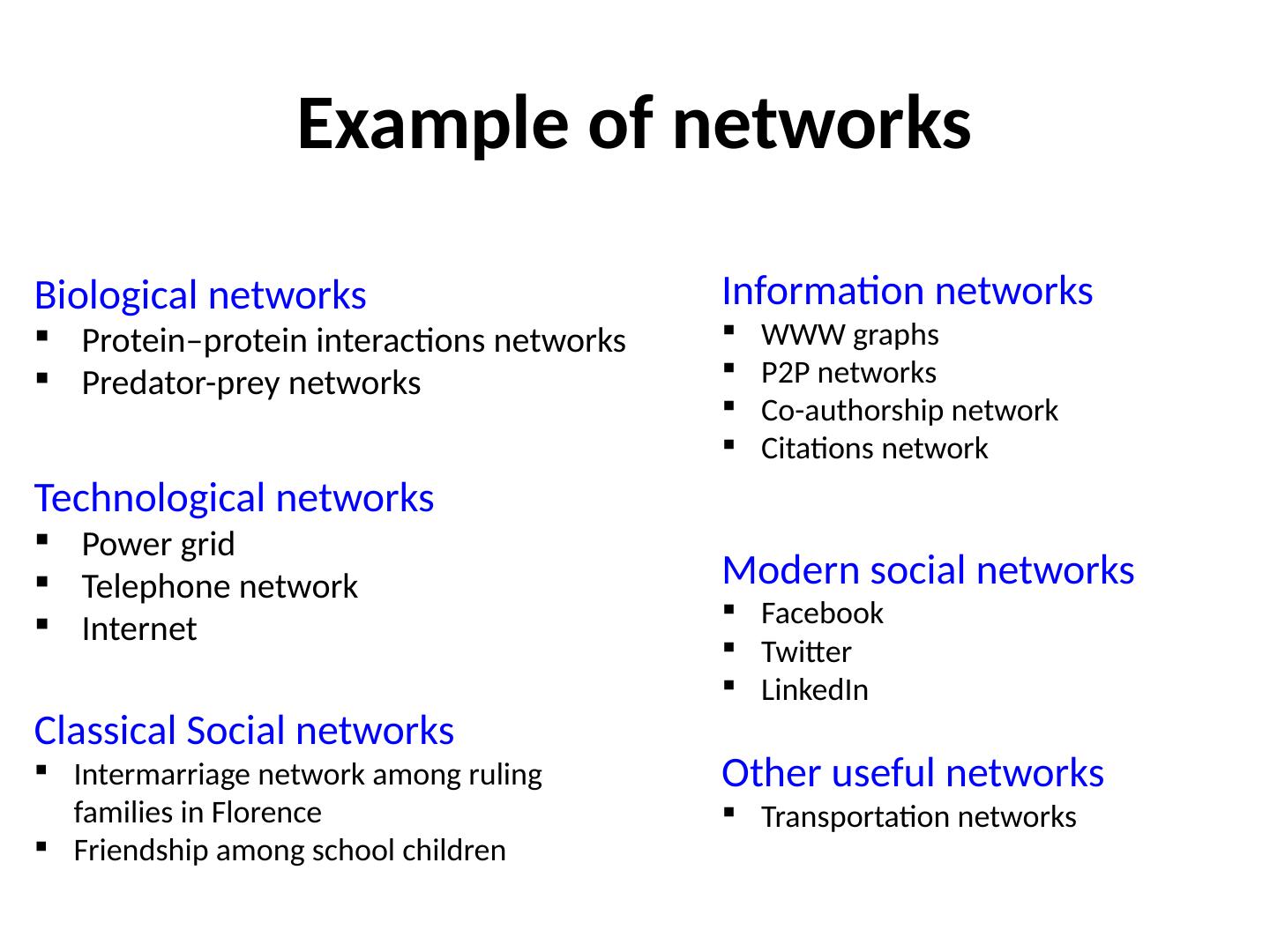 7 .Example of networks Biological networks Protein –protein interactions networks Predator-prey networks Technological networks Power grid Telephone network Internet Classical Social networks Intermarriage network among ruling families in Florence Friendship among school children Information networks WWW graphs P2P networks Co-authorship network Citations network Modern social networks Facebook Twitter LinkedIn Other useful networks Transportation networks