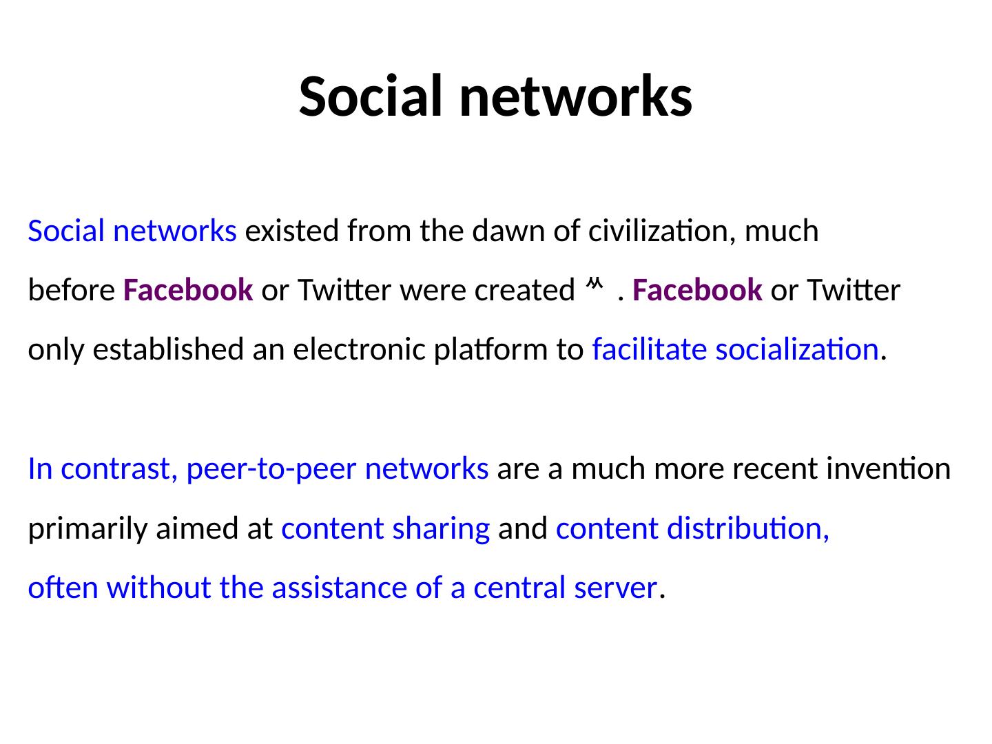 9 .Social networks Social networks existed from the dawn of civilization, much before Facebook or Twitter were created . Facebook or Twitter only established an electronic platform to facilitate socialization . In contrast, peer-to-peer networks are a much more recent invention primarily aimed at content sharing and content distribution, often without the assistance of a central server .