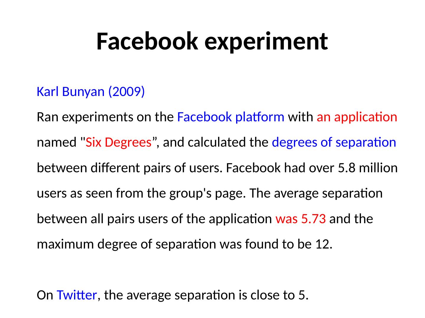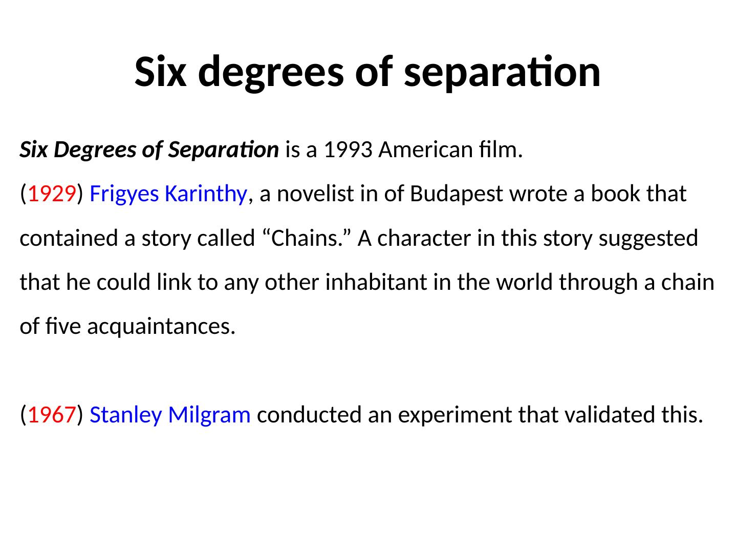11 .Six degrees of separation Six Degrees of Separation is a 1993 American film. ( 1929 ) Frigyes Karinthy , a novelist in of Budapest wrote a book that contained a story called “Chains.” A character in this story suggested that he could link to any other inhabitant in the world through a chain of five acquaintances. ( 1967 ) Stanley Milgram conducted an experiment that validated this.