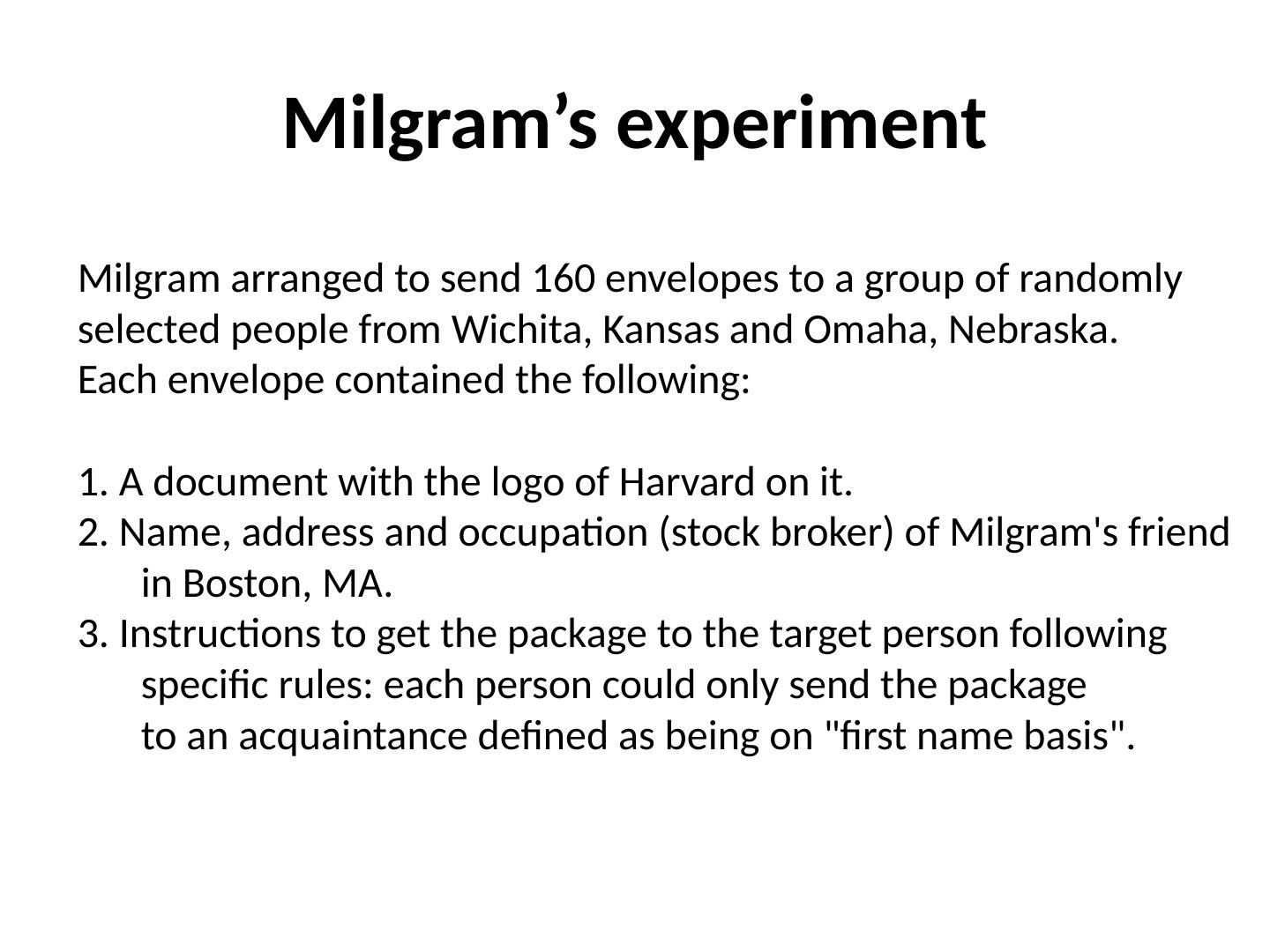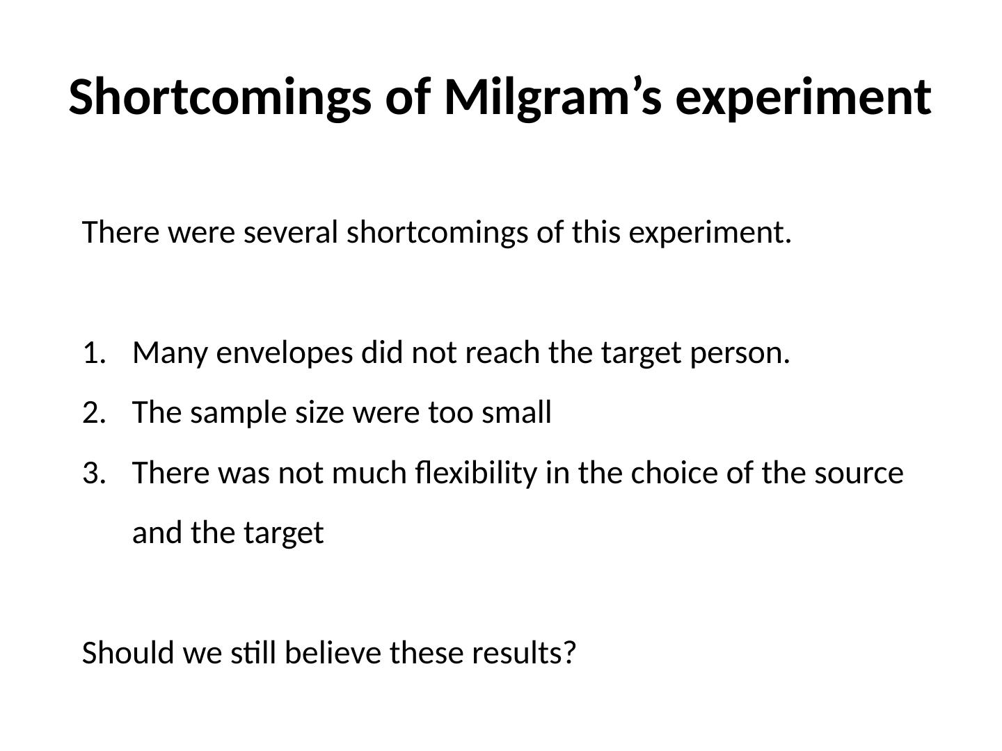 13 .Shortcomings of Milgram’s experiment There were several shortcomings of this experiment. Many envelopes did not reach the target person. The sample size were too small There was not much flexibility in the choice of the source and the target Should we still believe these results?