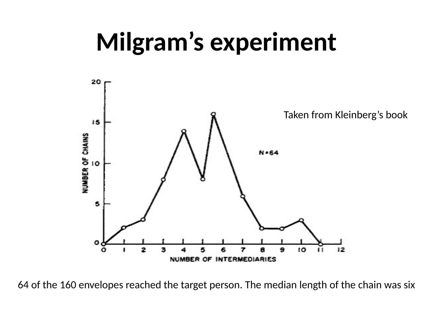12 .Milgram’s experiment Taken from Kleinberg’s book 64 of the 160 envelopes reached the target person. The median length of the chain was six
