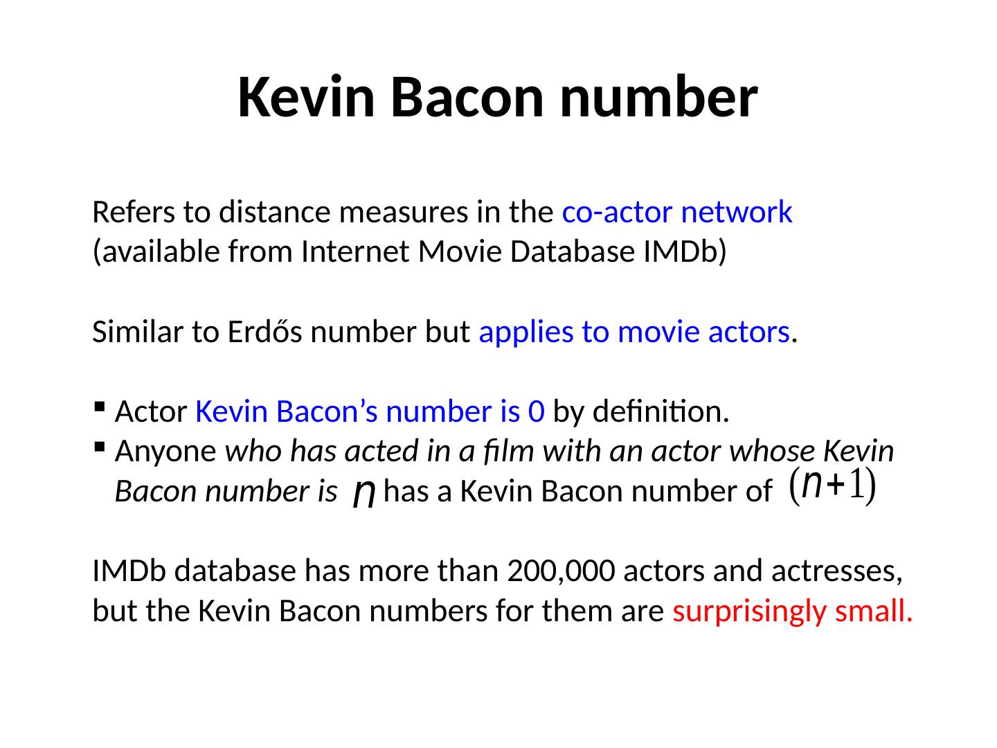 16 .Kevin Bacon number Refers to distance measures in the co-actor network (available from Internet Movie Database IMDb ) Similar to Erdős number but applies to movie actors . Actor Kevin Bacon’s number is 0 by definition. Anyone who has acted in a film with an actor whose Kevin Bacon number is has a Kevin Bacon number of IMDb database has more than 200,000 actors and actresses, but the Kevin Bacon numbers for them are surprisingly small.