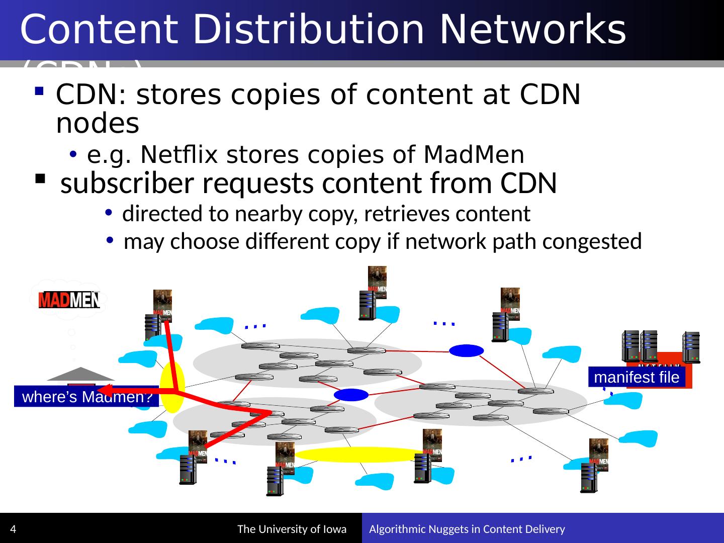 4 .Content Distribution Networks (CDNs) … … … … … … subscriber requests content from CDN CDN: stores copies of content at CDN nodes e.g. Netflix stores copies of MadMen where’s Madmen? manifest file directed to nearby copy, retrieves content may choose different copy if network path congested Algorithmic Nuggets in Content Delivery 4