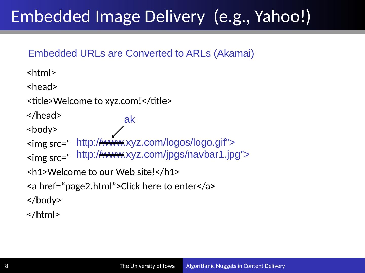 8 .Embedded Image Delivery (e.g., Yahoo!) <html> <head> <title>Welcome to xyz.com!</title> </head> <body> < img src =“ < img src =“ <h1>Welcome to our Web site!</h1> <a href =“page2.html”>Click here to enter</a> </body> </html> http://www.xyz.com/logos/logo.gif”> http://www.xyz.com/ jpgs /navbar1.jpg”> Embedded URLs are Converted to ARLs (Akamai) ak Algorithmic Nuggets in Content Delivery 8