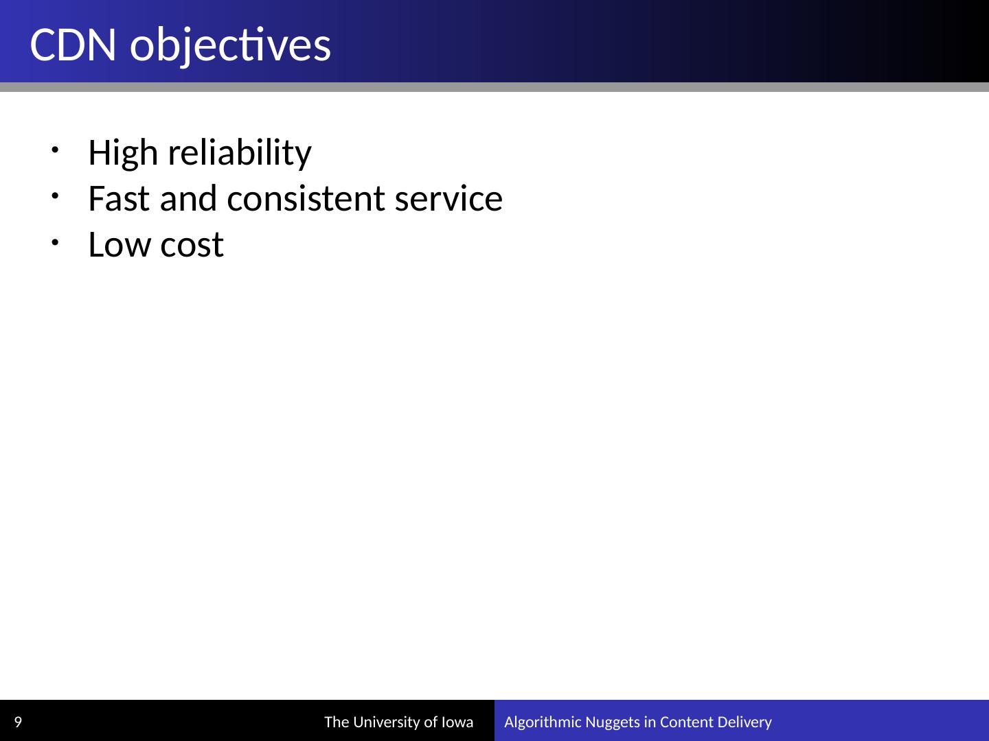9 .CDN objectives High reliability Fast and consistent service Low cost Algorithmic Nuggets in Content Delivery 9