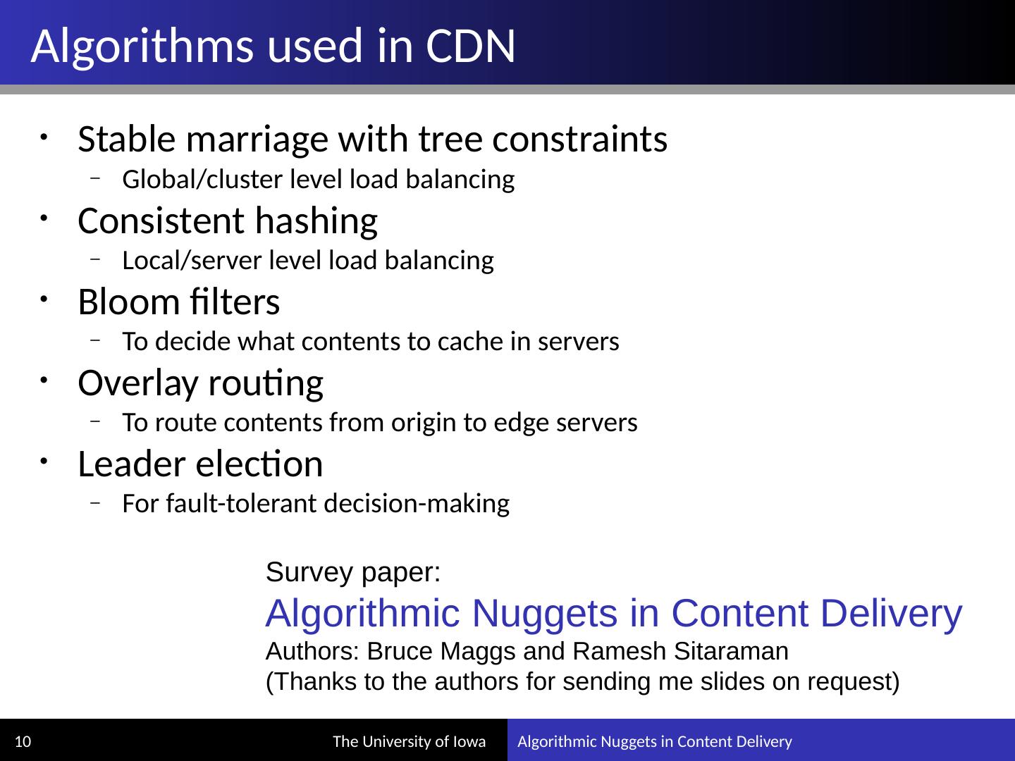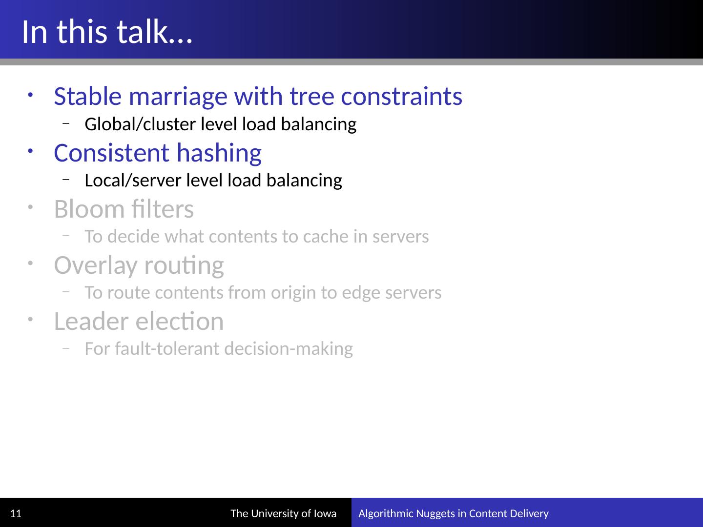 10 .Algorithms used in CDN Stable marriage with tree constraints Global/cluster level load balancing Consistent hashing Local/server level load balancing Bloom filters To decide what contents to cache in servers Overlay routing To route contents from origin to edge servers Leader election For fault-tolerant decision-making Algorithmic Nuggets in Content Delivery 10 Survey paper: Algorithmic Nuggets in Content Delivery Authors: Bruce Maggs and Ramesh Sitaraman (Thanks to the authors for sending me slides on request)