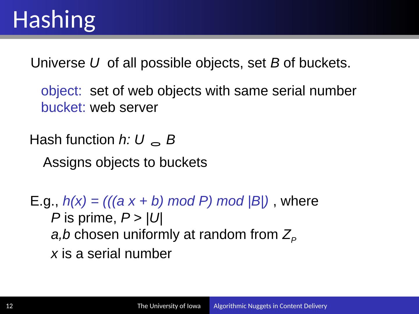 12 .Hashing Algorithmic Nuggets in Content Delivery 12 E.g., h(x) = (((a x + b) mod P) mod |B|) , where P is prime, P > |U| a,b chosen uniformly at random from Z P x is a serial number Universe U of all possible objects, set B of buckets. object: set of web objects with same serial number bucket: web server Hash function h: U B Assigns objects to buckets