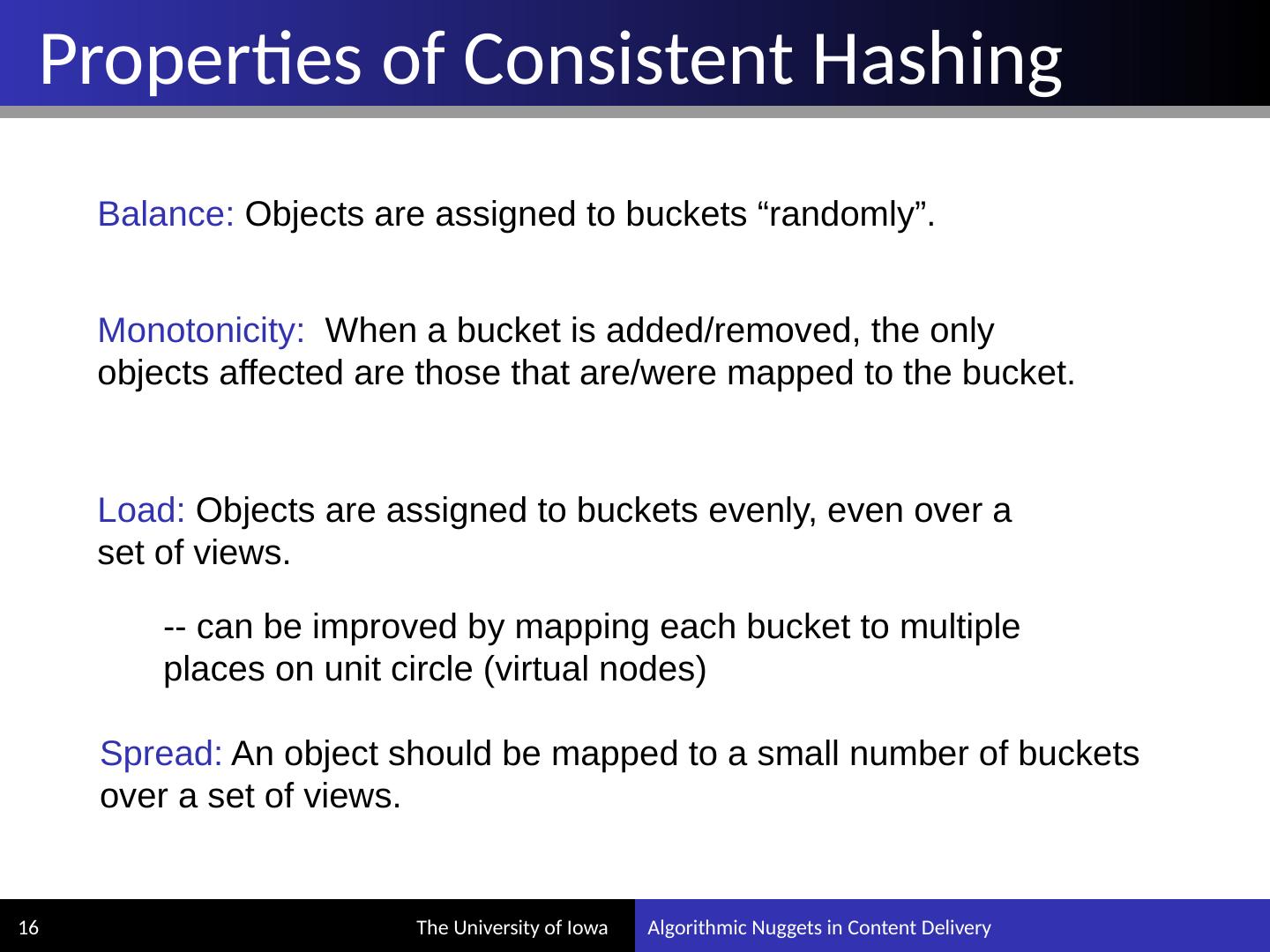 15 .Consistent Hashing Algorithmic Nuggets in Content Delivery 15 Idea: Map both objects and buckets to unit circle. Object Bucket/server Assign object to next bucket on circle in clockwise order. new bucket