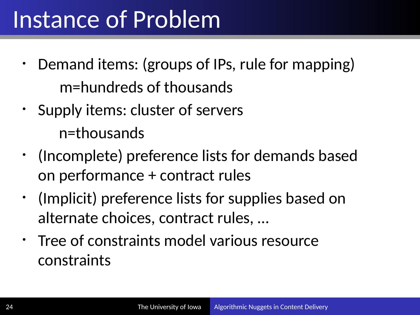 24 .Instance of Problem Demand items: (groups of IPs, rule for mapping) m=hundreds of thousands Supply items: cluster of servers n=thousands (Incomplete) preference lists for demands based on performance + contract rules (Implicit) preference lists for supplies based on alternate choices, contract rules, … Tree of constraints model various resource constraints Algorithmic Nuggets in Content Delivery 24