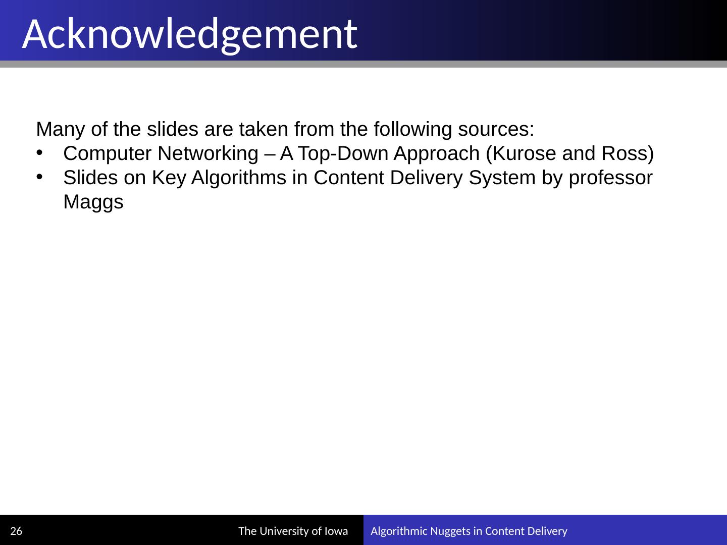 26 .Acknowledgement 26 Algorithmic Nuggets in Content Delivery Many of the slides are taken from the following sources: Computer Networking – A Top-Down Approach (Kurose and Ross) Slides on Key Algorithms in Content Delivery System by professor Maggs