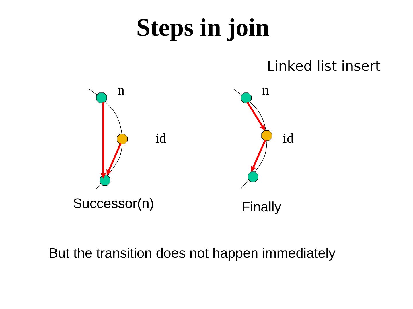 15 . Steps in join Linked list insert n n id id Successor(n) Finally But the transition does not happen immediately