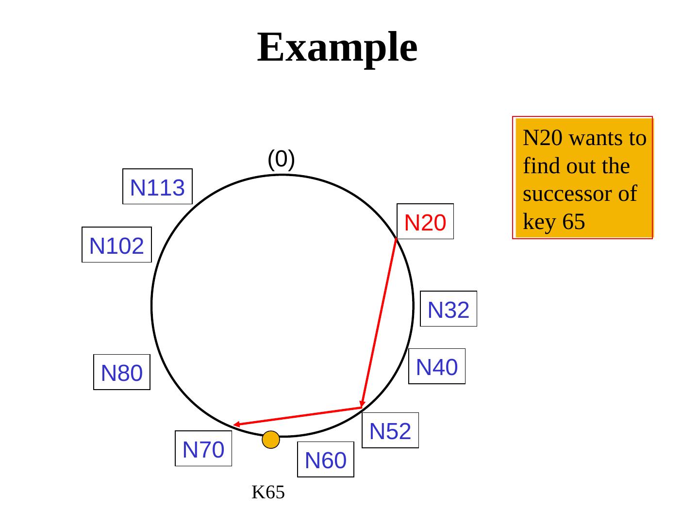 17 . Example N20 wants to (0) find out the N113 successor of N20 key 65 N102 N32 N80 N40 N52 N70 N60 K65