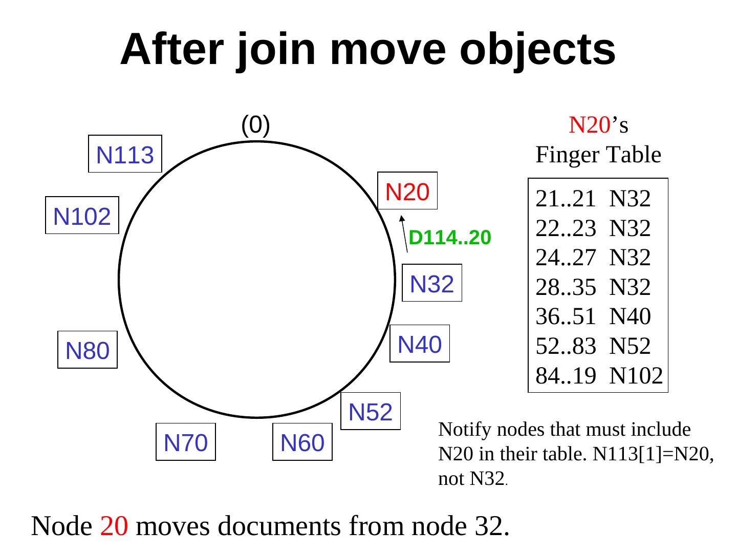 19 . Three steps in join Step 1. Initialize predecessor and fingers of the new node. (Knowledge of predecessor is useful in stabilization ) Step 2. Update the predecessor and the fingers of the existing nodes. (Thus notify nodes that must include N20 in their table. N113[1] = N20, not N32. Step 3. Transfer objects to the new node as appropriate.