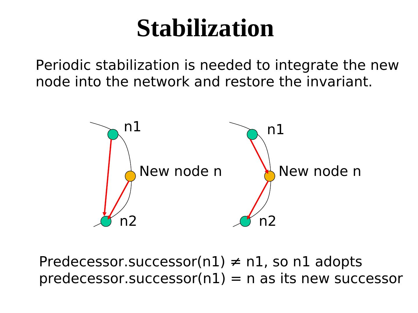 21 . Stabilization Periodic stabilization is needed to integrate the new node into the network and restore the invariant. n1 n1 New node n New node n n2 n2 Predecessor.successor(n1) ≠ n1, so n1 adopts predecessor.successor(n1) = n as its new successor