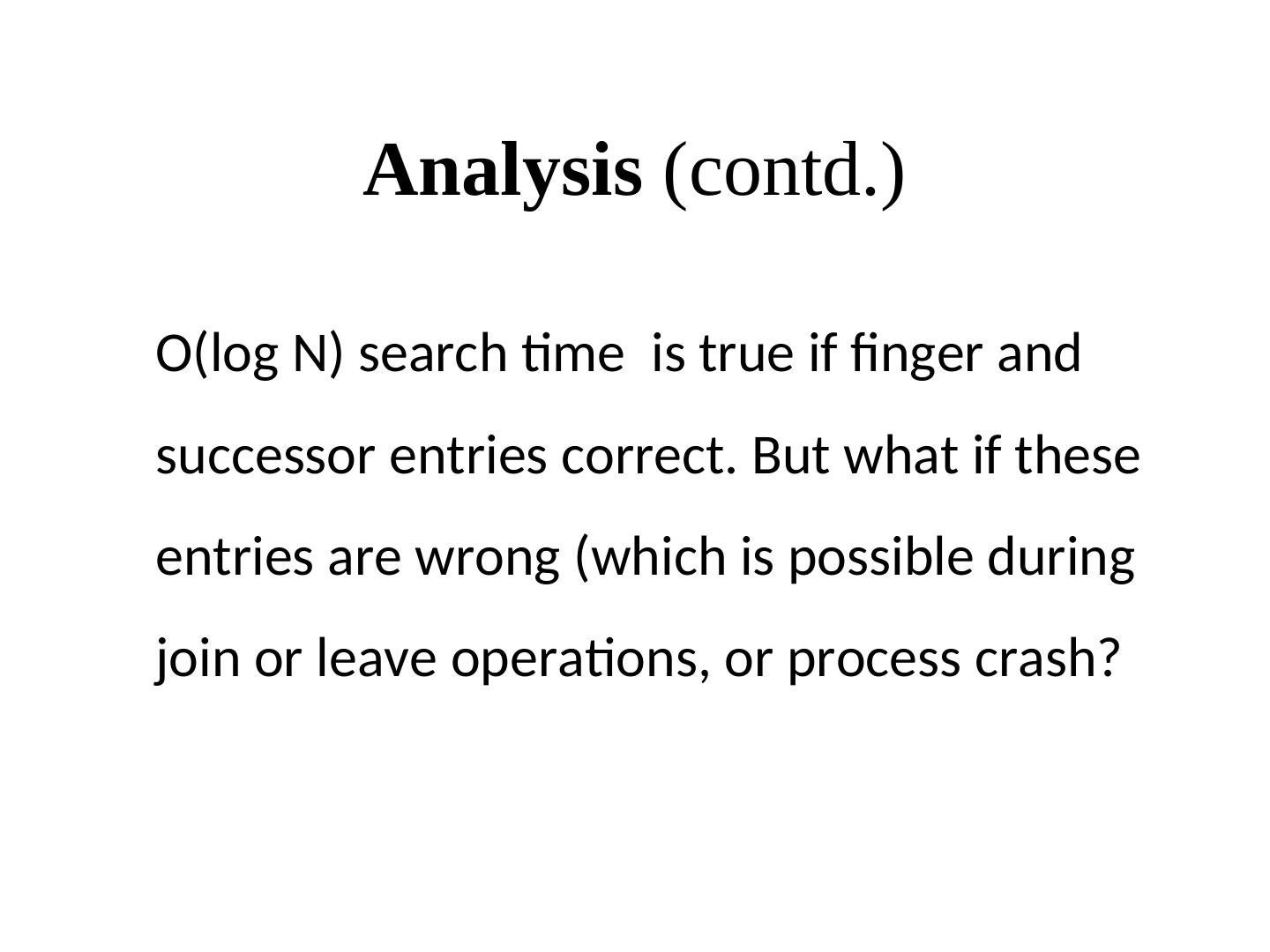 3 . Analysis (contd.) O(log N) search time is true if finger and successor entries correct. But what if these entries are wrong (which is possible during join or leave operations, or process crash?