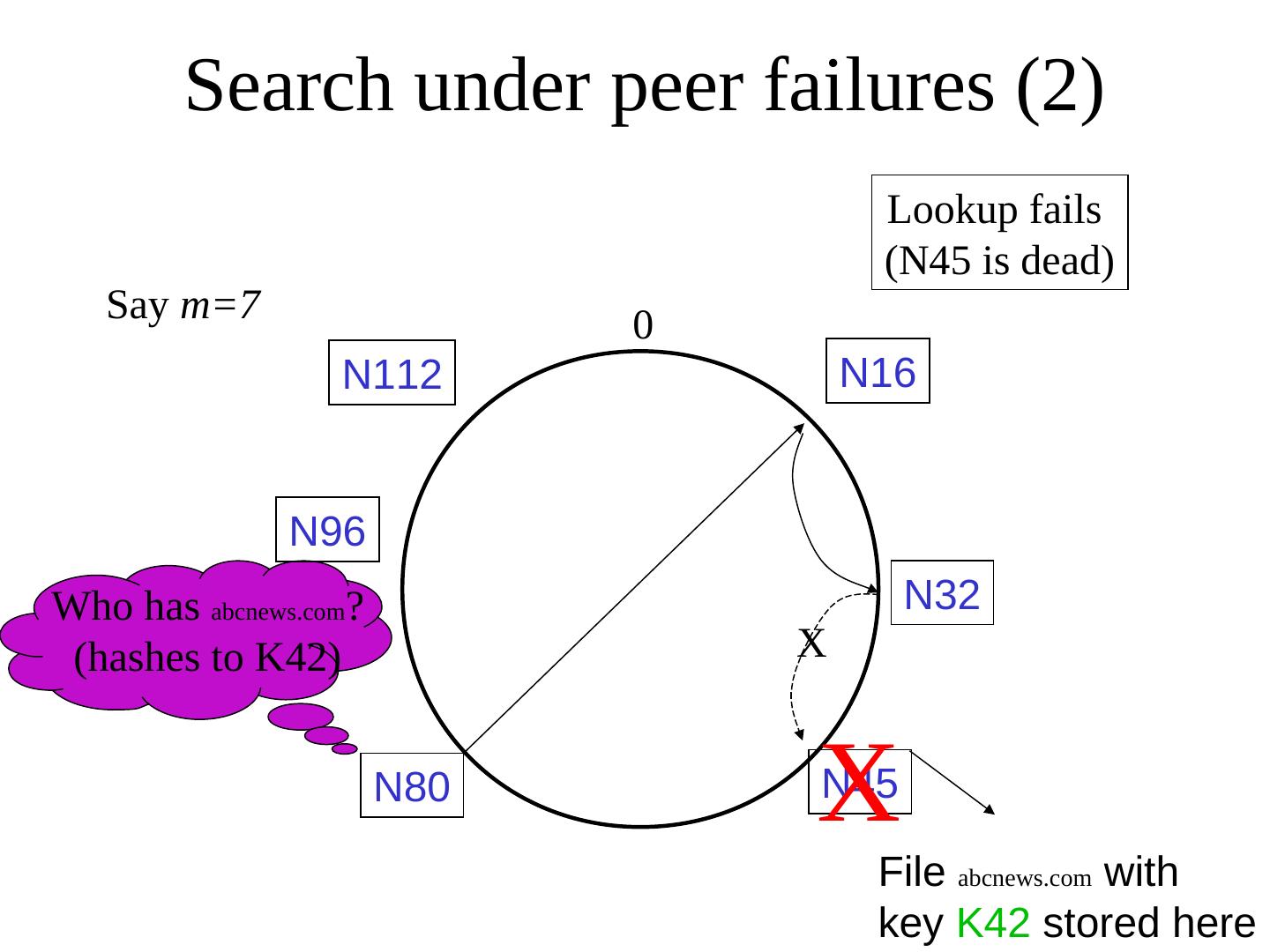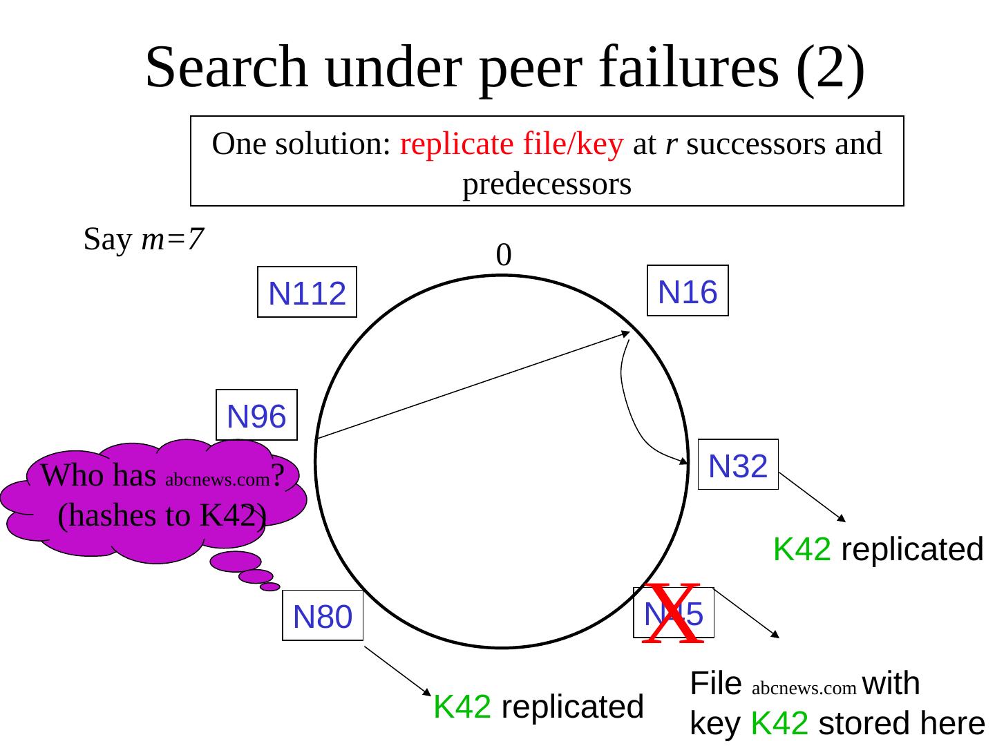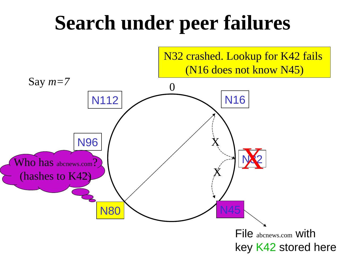 4 . Search under peer failures N32 crashed. Lookup for K42 fails (N16 does not know N45) Say m=7 0 N112 N16 N96 X Who has abcnews.com? (hashes to K42) X X N32 N80 N45 File abcnews.com with key K42 stored here