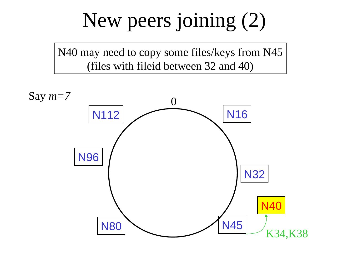 11 . New peers joining (2) N40 may need to copy some files/keys from N45 (files with fileid between 32 and 40) Say m=7 0 N112 N16 N96 N32 N40 N80 N45 K34,K38