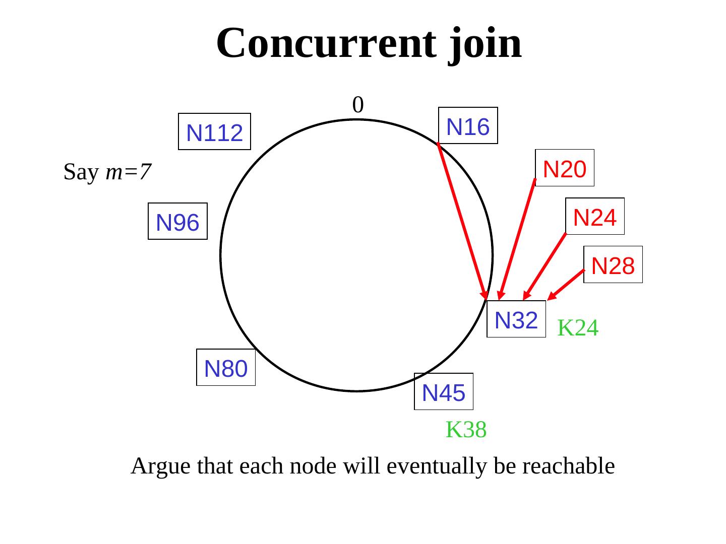 12 . Concurrent join 0 N112 N16 Say m=7 N20 N96 N24 N28 N32 K24 N80 N45 K38 Argue that each node will eventually be reachable