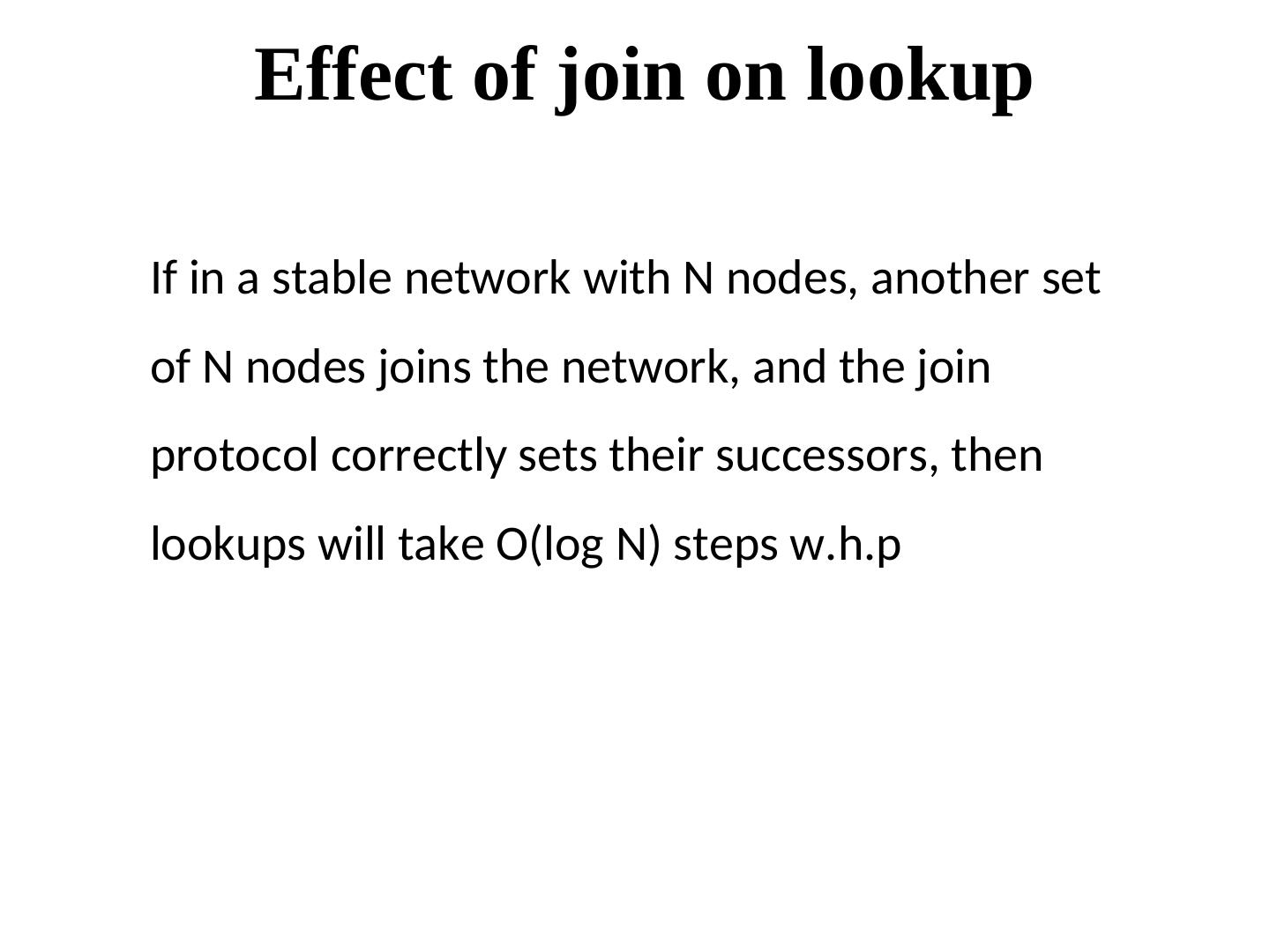 13 . Effect of join on lookup If in a stable network with N nodes, another set of N nodes joins the network, and the join protocol correctly sets their successors, then lookups will take O(log N) steps w.h.p