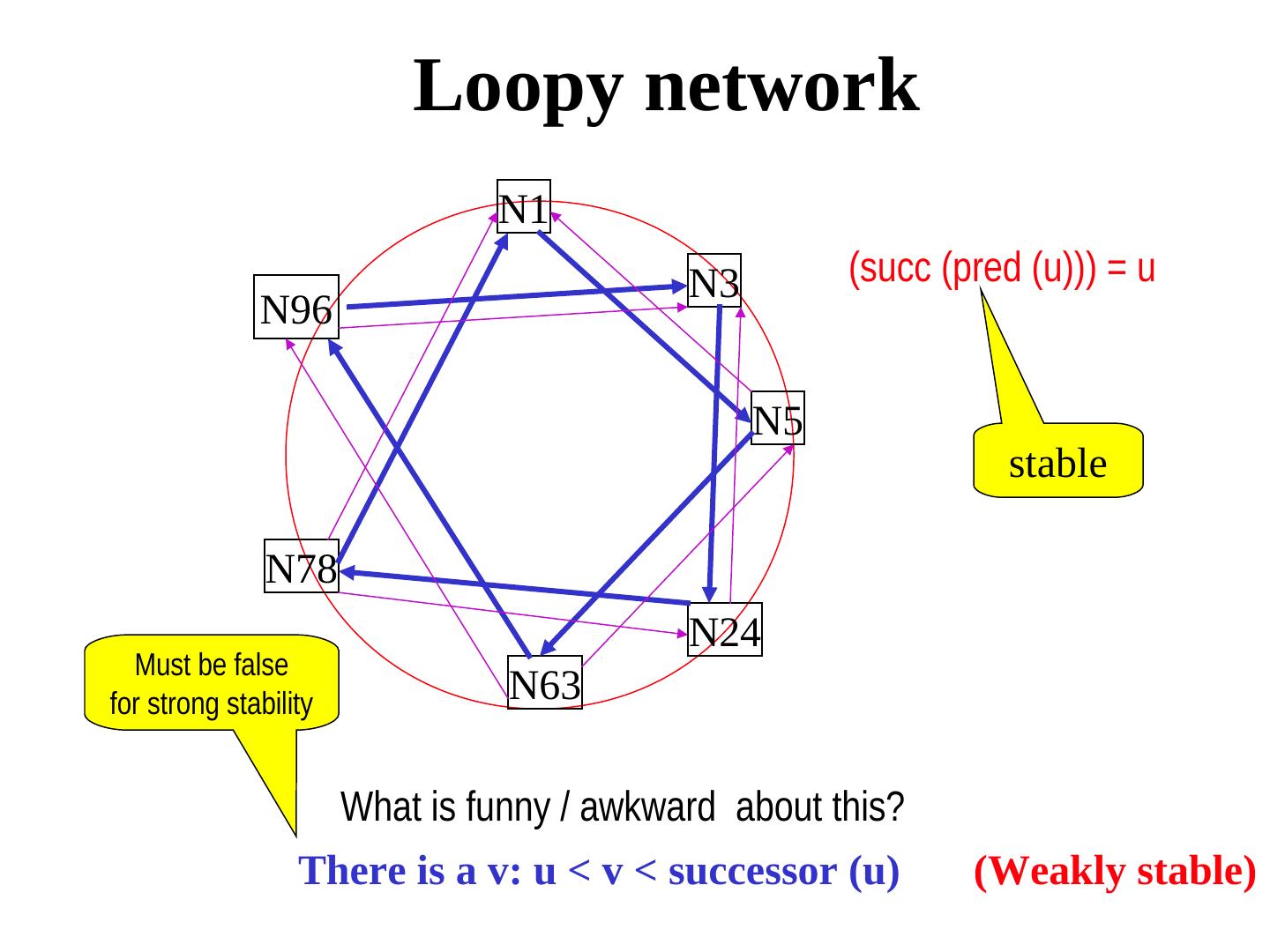 16 . Loopy network N1 N3 (succ (pred (u))) = u N96 N5 stable N78 N24 Must be false for strong stability N63 What is funny / awkward about this? There is a v: u < v < successor (u) (Weakly stable)