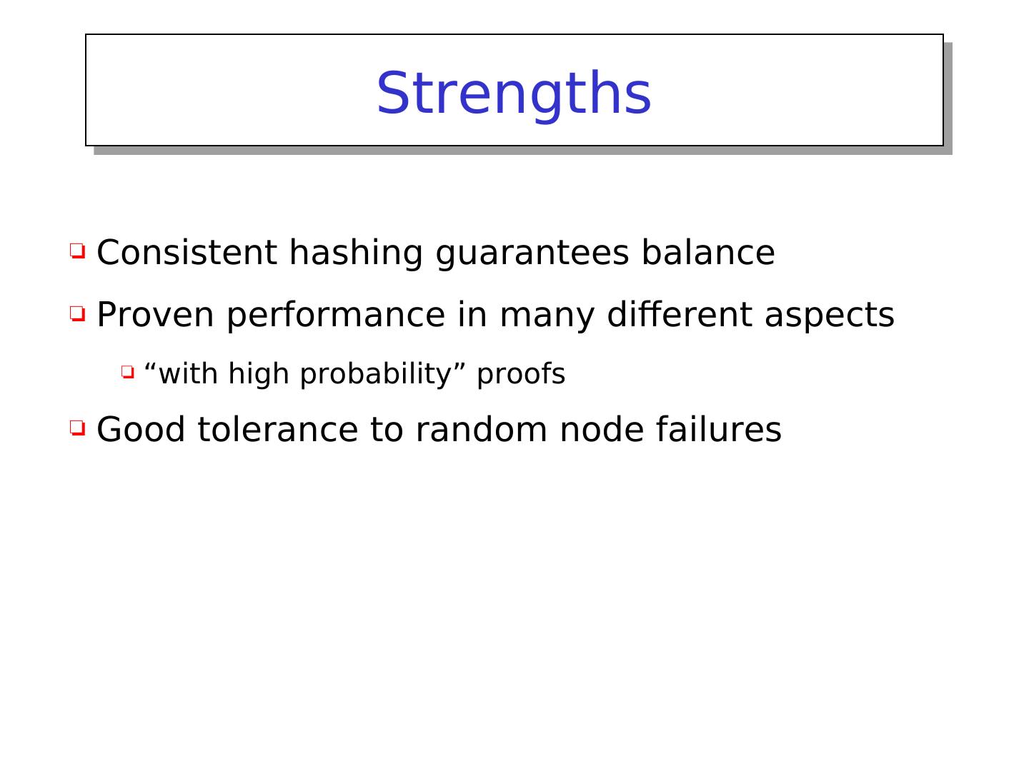 22 . Strengths Strengths Consistent hashing guarantees balance Proven performance in many different aspects “with high probability” proofs Good tolerance to random node failures