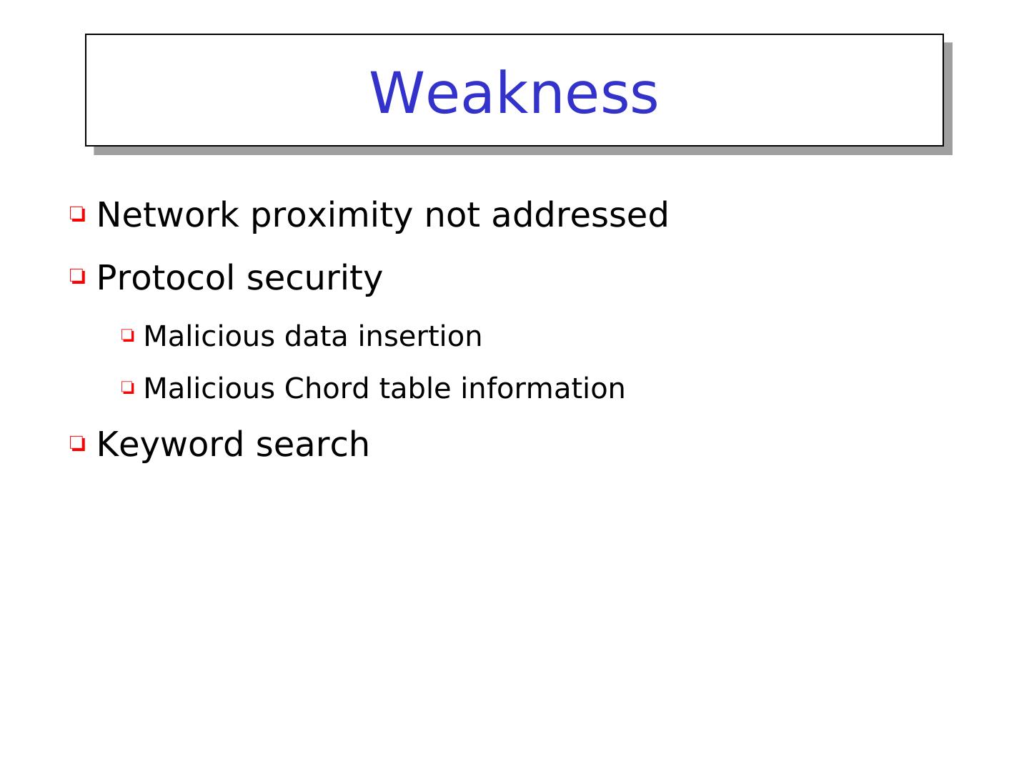 23 . Weakness Weakness Network proximity not addressed Protocol security Malicious data insertion Malicious Chord table information Keyword search