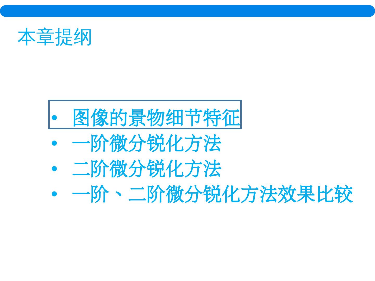 4 . 本章提纲 图像的景物细节特征 一阶微分锐化方法 二阶微分锐化方法 一阶、二阶微分锐化方法效果比较