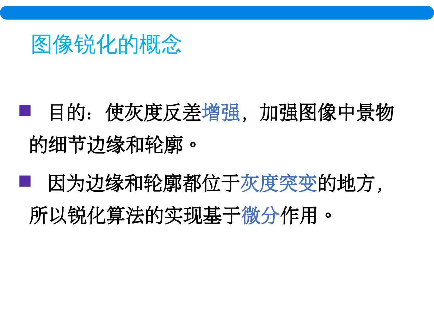 5 . 目的:使灰度反差 增强 ,加强图像中景物的细节边缘和轮廓。 因为边缘和轮廓都位于 灰度突变 的地方,所以锐化算法的实现基于 微分 作用。 图像锐化的概念