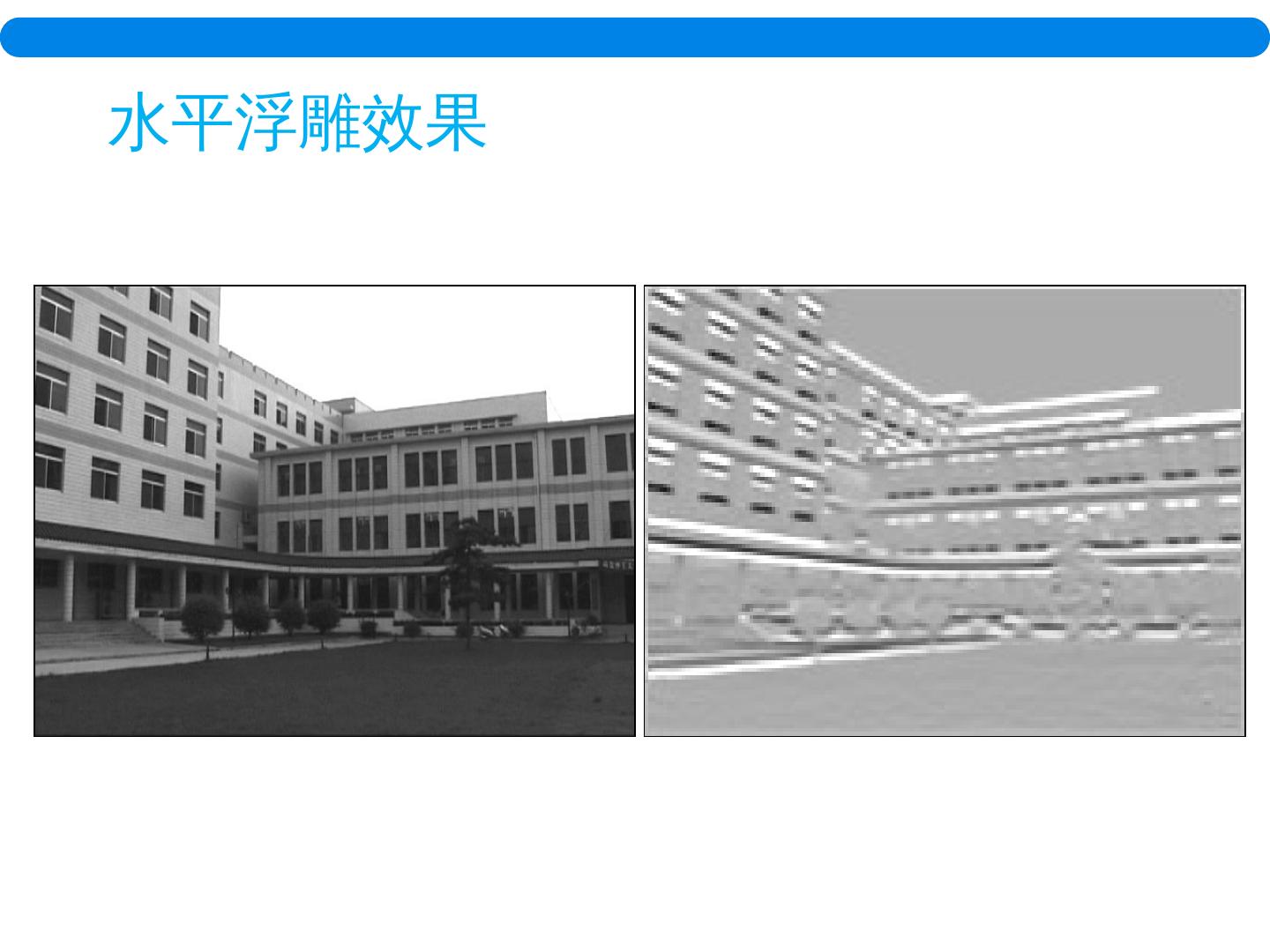 18 .单方向锐化的后处理:方法 1 方法 1 : 整体加一个正整数 ,以保证所有的像素值均为正。可以获得类似 浮雕 的效果。 20 20 20 20 20 20 17 7 0 20 20 14 7 7 20 20 21 32 25 20 20 20 20 20 20 0 0 0 0 0 0 -3 -13 -20 0 0 -6 -13 -13 0 0 1 12 5 0 0 0 0 0 0