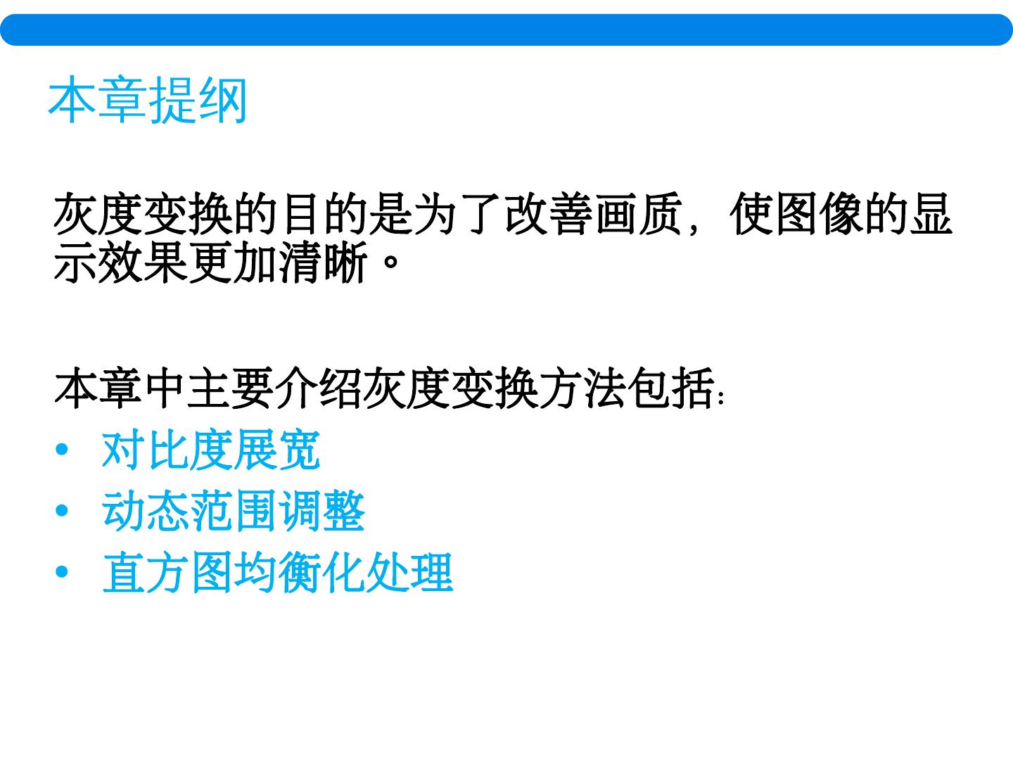 2 . 本章提纲 本章中主要介绍灰度变换方法包括 : 对比度展宽 动态范围调整 直方图均衡化处理 灰度变换的目的是为了改善画质,使图像的显示效果更加清晰。