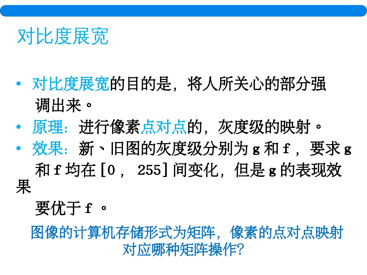 3 . 对比度展宽 对比度展宽 的目的是,将人所关心的部分强 调出来。 原理: 进行像素 点对点 的,灰度级的映射。 效果: 新、旧图的灰度级分别为 g 和 f ,要求 g 和 f 均在 [0 , 255] 间变化,但是 g 的表现效果 要优于 f 。 图像的计算机存储形式为矩阵,像素的点对点映射对应哪种矩阵操作?