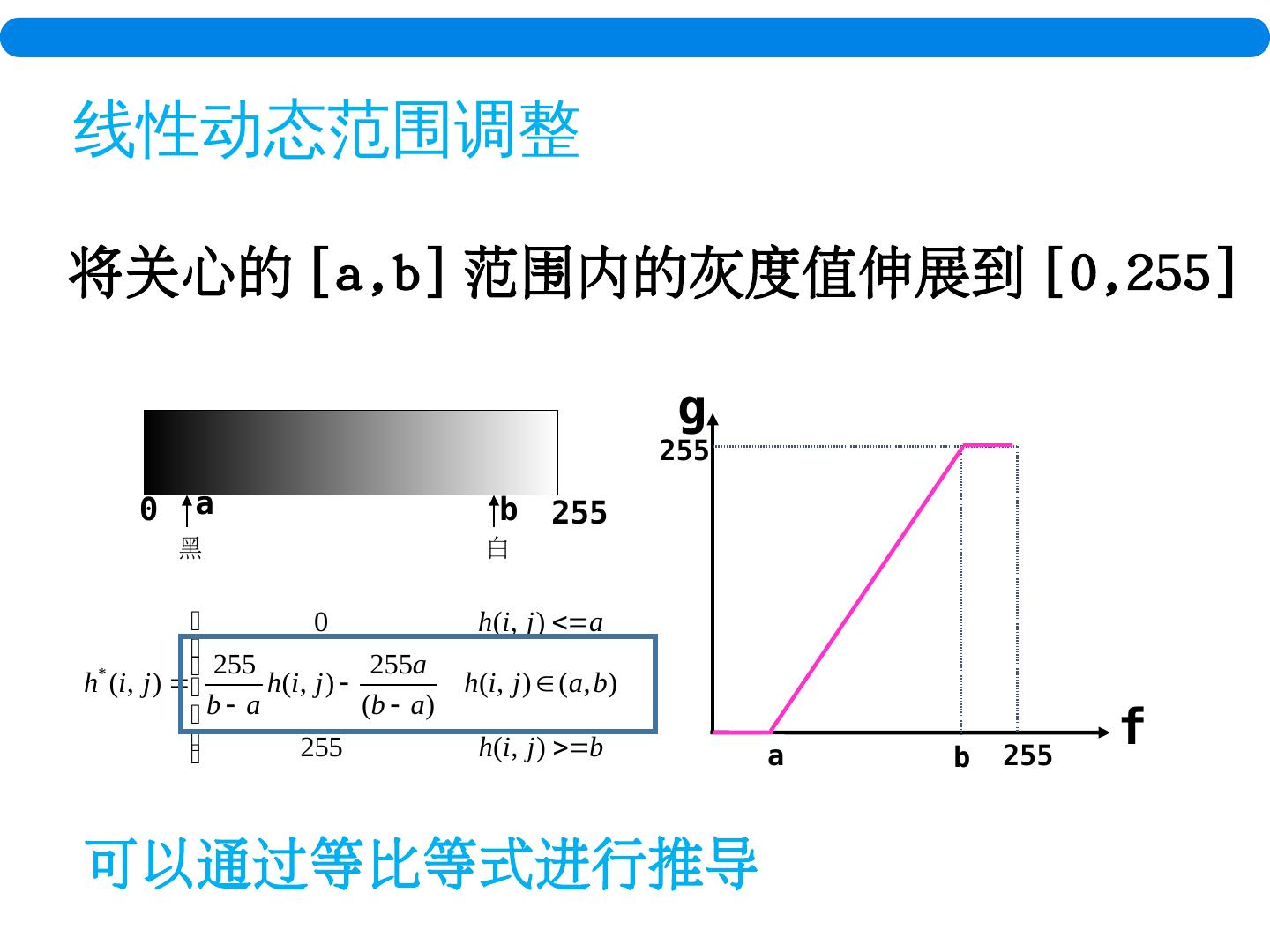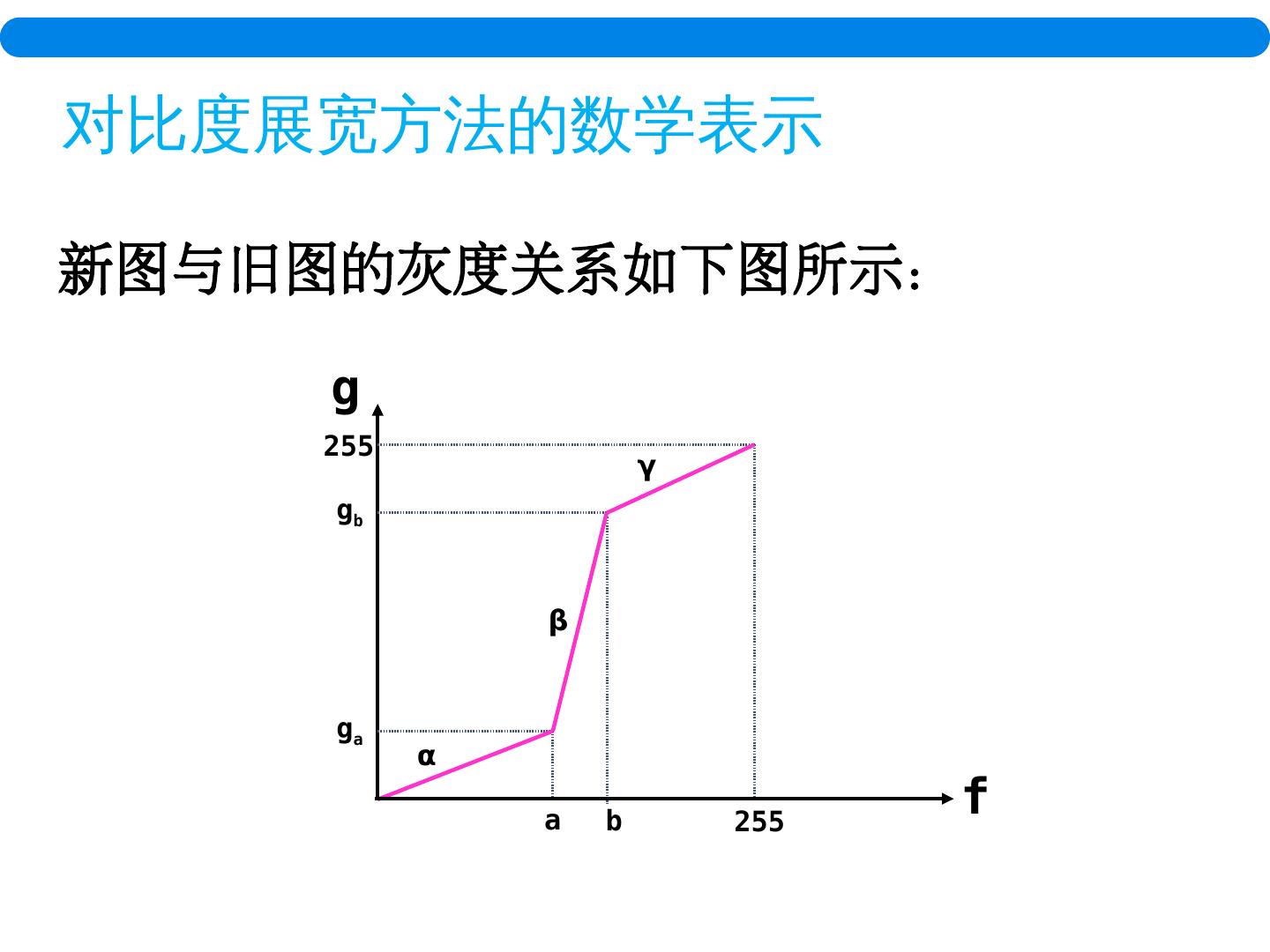 6 . 对比度展宽方法的数学表示 新图与旧图的灰度关系如下图所示: 255 a b f g 255 g a g b α γ β