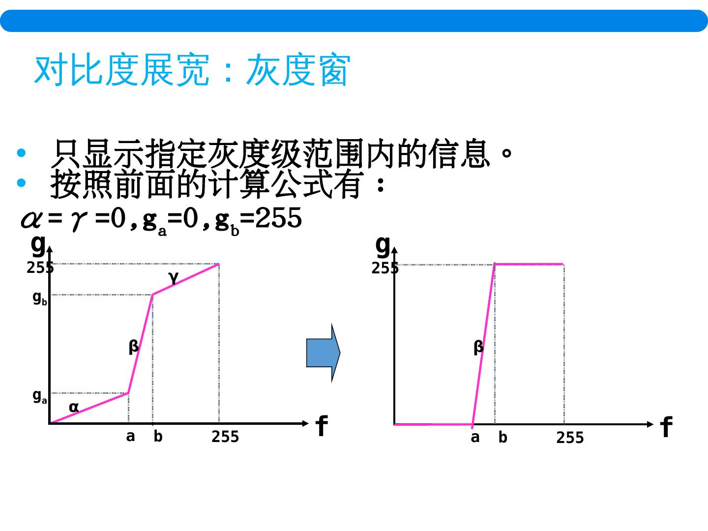 7 . 对比度展宽:灰度窗 只显示指定灰度级范围内的信息。 按照前面的计算公式有 : α=γ=0,g a =0,g b =255 255 a b f g 255 g a g b α γ β 255 a b f g 255 β