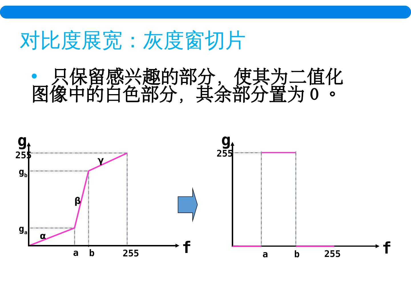 9 . 对比度展宽:灰度窗切片 只保留感兴趣的部分,使其为二值化图像中的白色部分,其余部分置为 0 。 255 a b f g 255 g a g b α γ β 255 a b f g 255