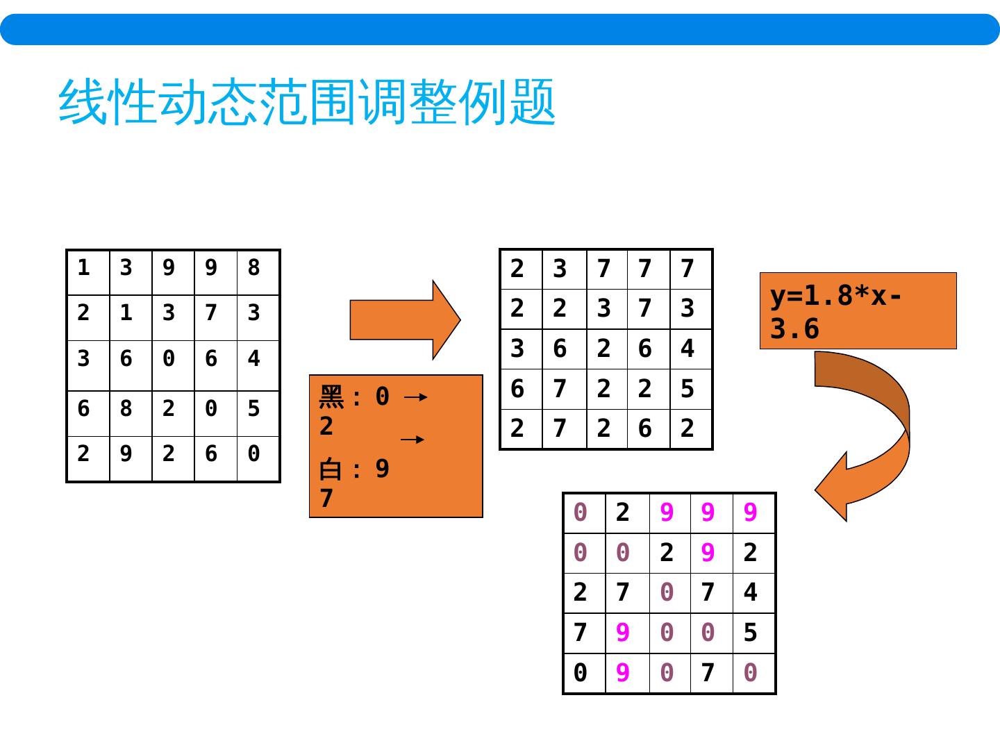 16 . 线性动态范围调整例题 1 3 9 9 8 2 1 3 7 3 3 6 0 6 4 6 8 2 0 5 2 9 2 6 0 黑: 0 2 白: 9 7 2 3 7 7 7 2 2 3 7 3 3 6 2 6 4 6 7 2 2 5 2 7 2 6 2 0 2 9 9 9 0 0 2 9 2 2 7 0 7 4 7 9 0 0 5 0 9 0 7 0 y=1.8*x-3.6