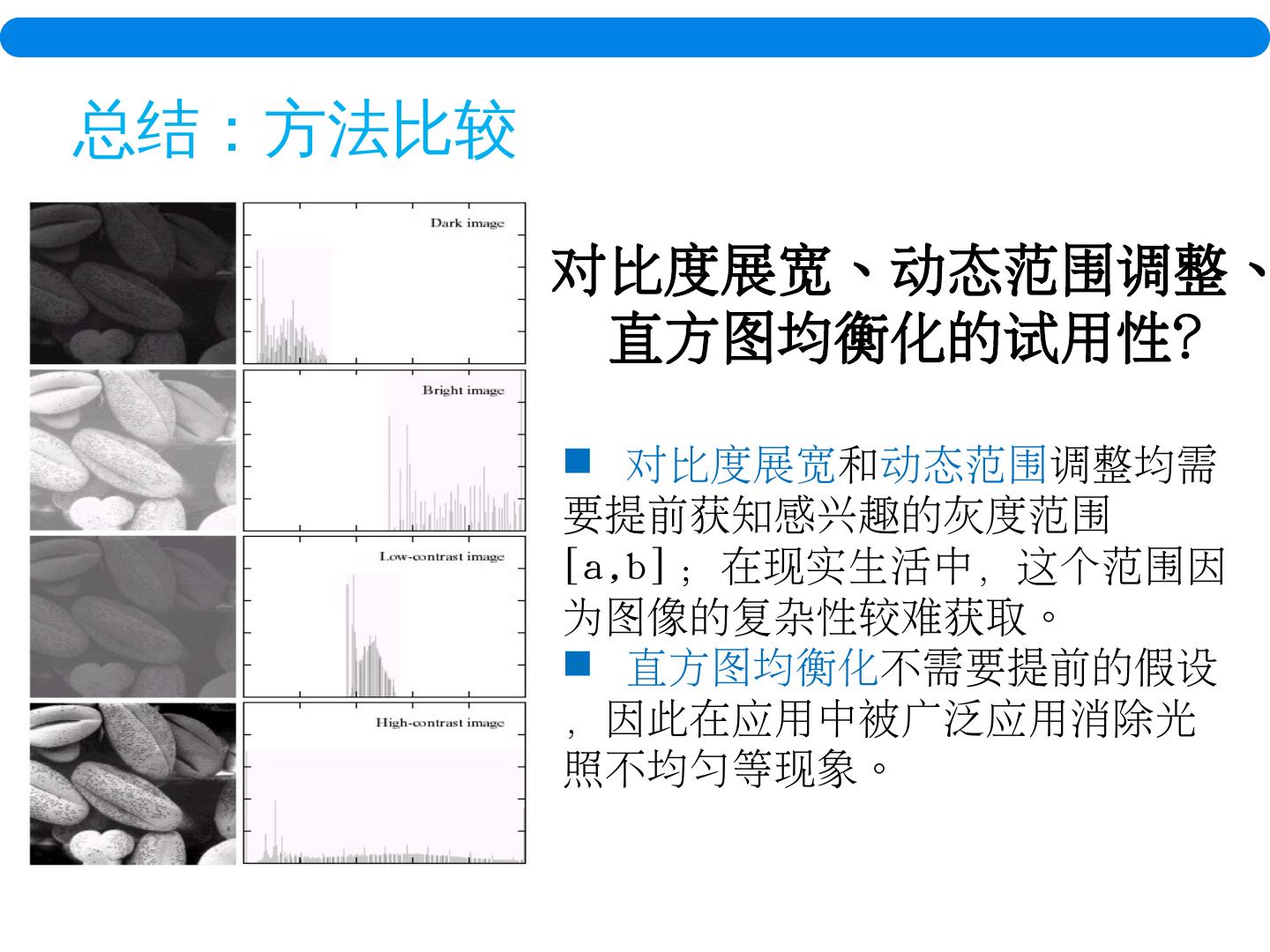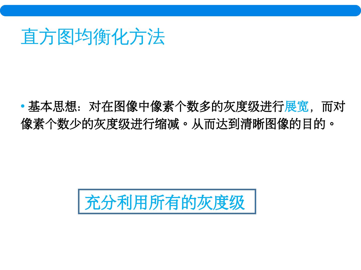 21 . 直方图均衡化方法 基本思想:对在图像中像素个数多的灰度级进行 展宽 ,而对像素个数少的灰度级进行缩减。从而达到清晰图像的目的。 充分利用所有的灰度级