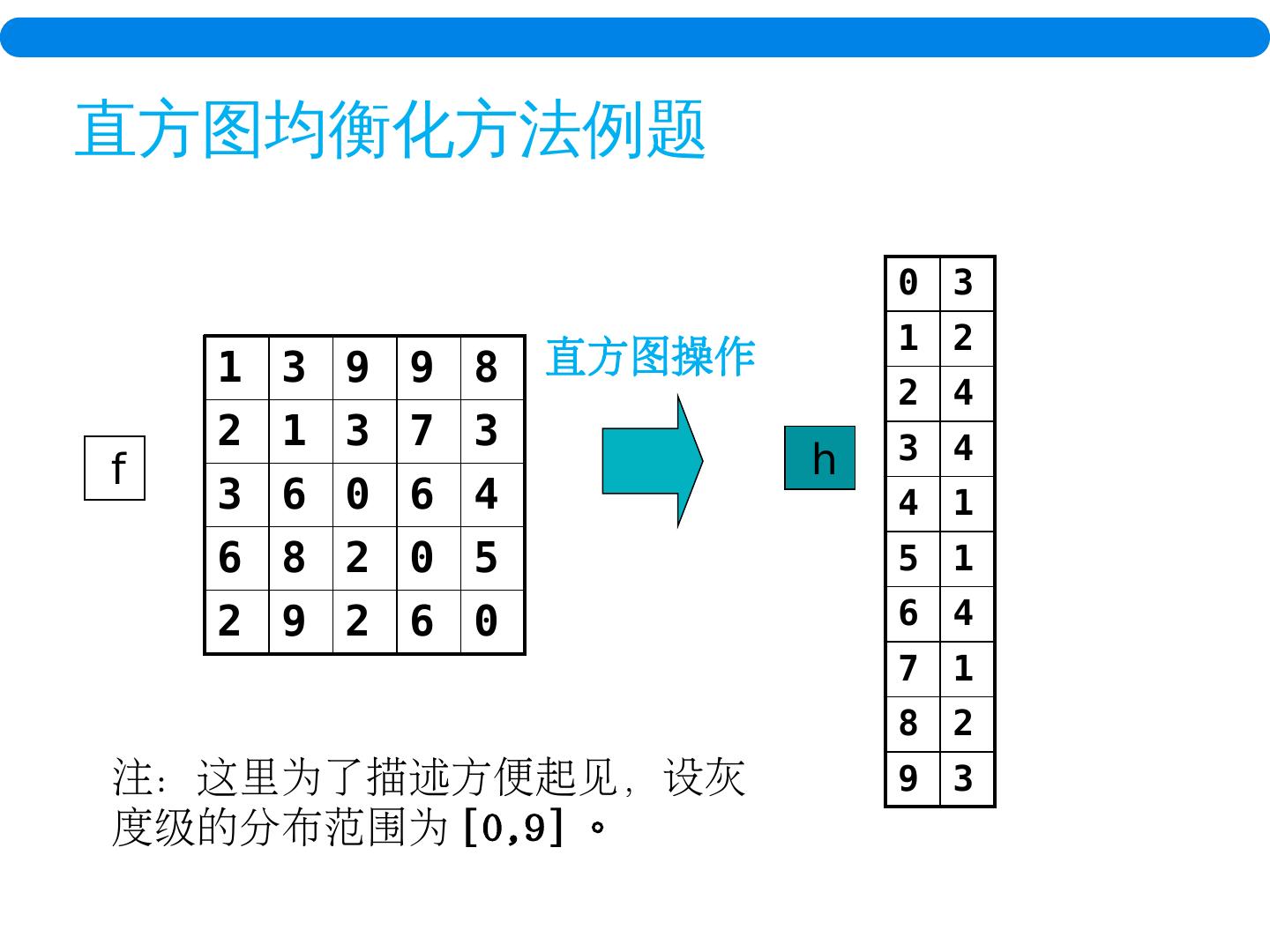 23 . 直方图均衡化方法例题 1 3 9 9 8 2 1 3 7 3 3 6 0 6 4 6 8 2 0 5 2 9 2 6 0 f h 0 3 1 2 2 4 3 4 4 1 5 1 6 4 7 1 8 2 9 3 注:这里为了描述方便起见,设灰度级的分布范围为 [0,9] 。 直方图操作