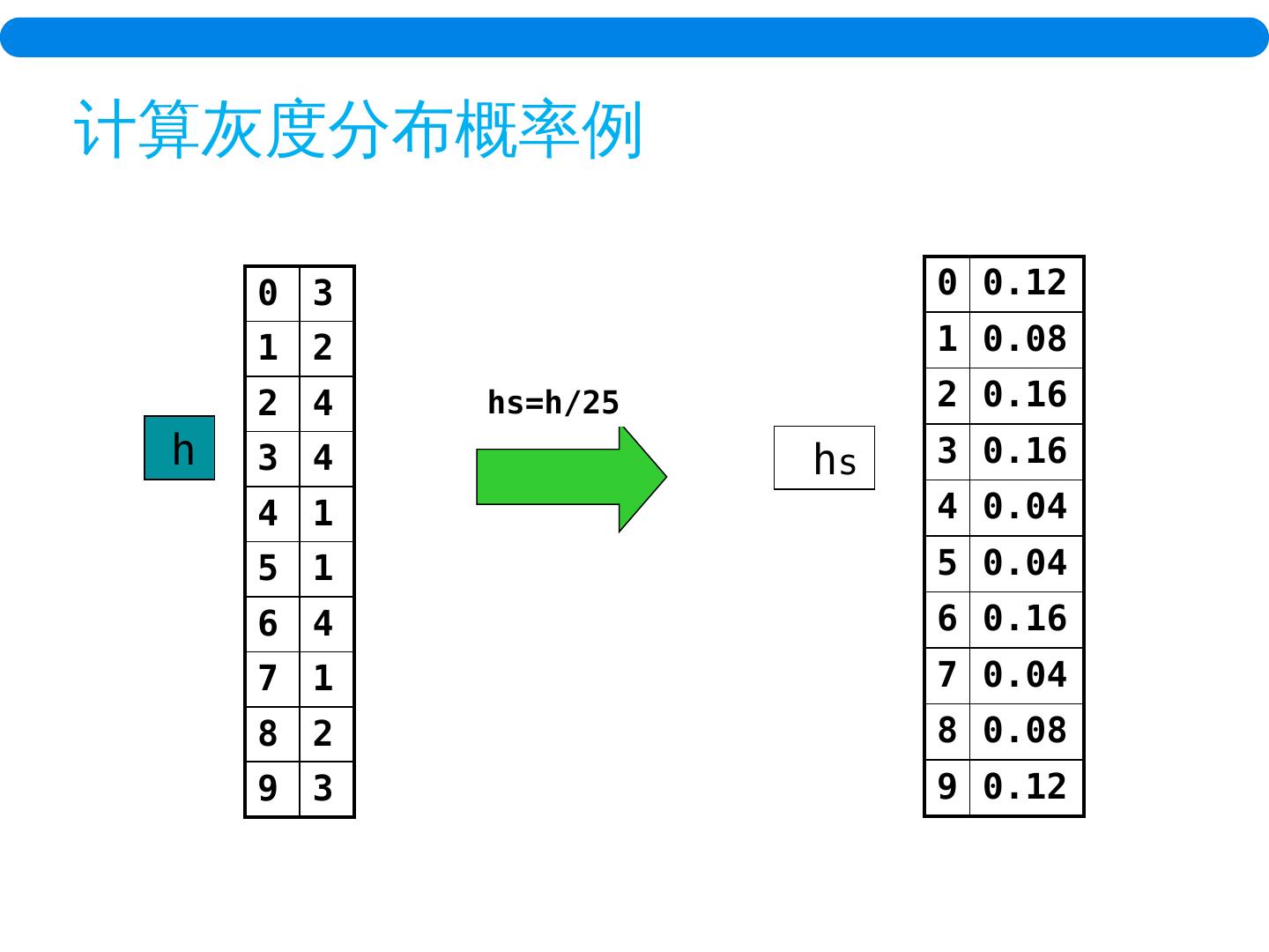 25 . 计算灰度分布概率例 h s 0 0.12 1 0.08 2 0.16 3 0.16 4 0.04 5 0.04 6 0.16 7 0.04 8 0.08 9 0.12 h 0 3 1 2 2 4 3 4 4 1 5 1 6 4 7 1 8 2 9 3 hs=h/25